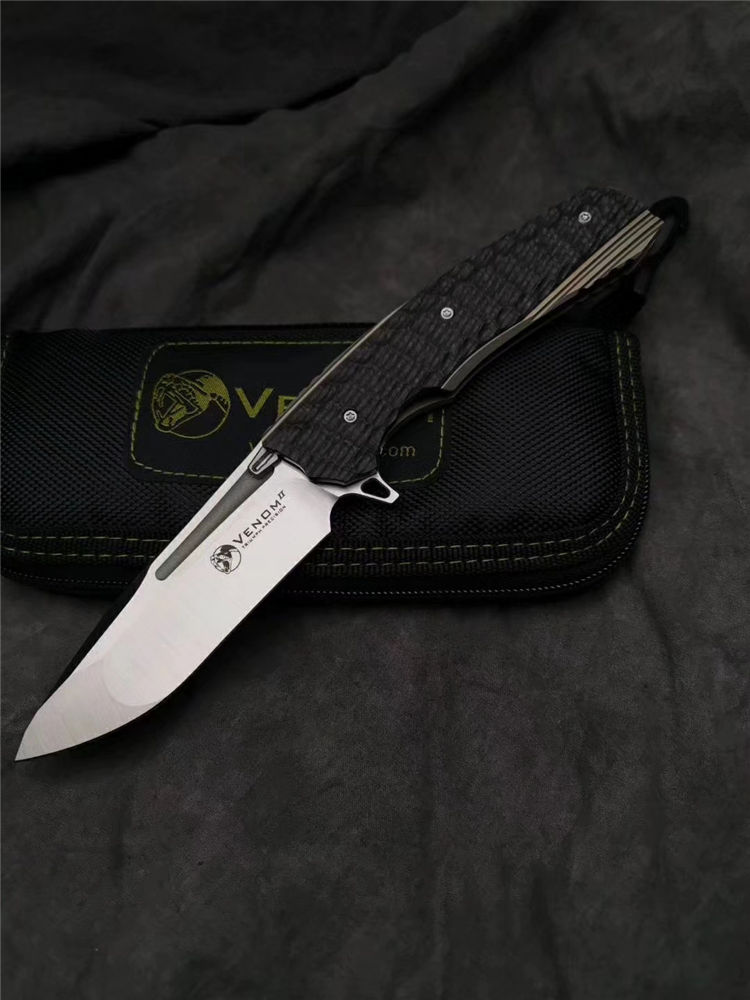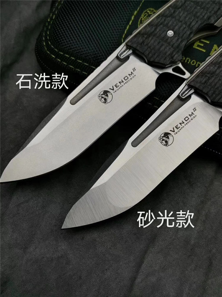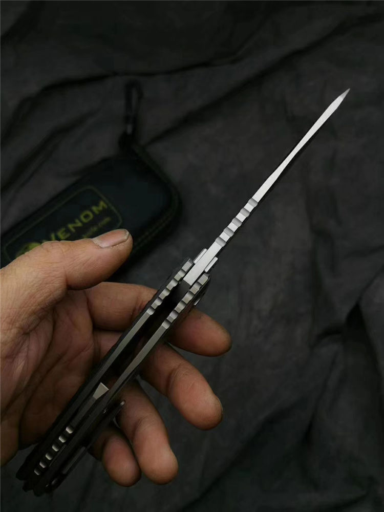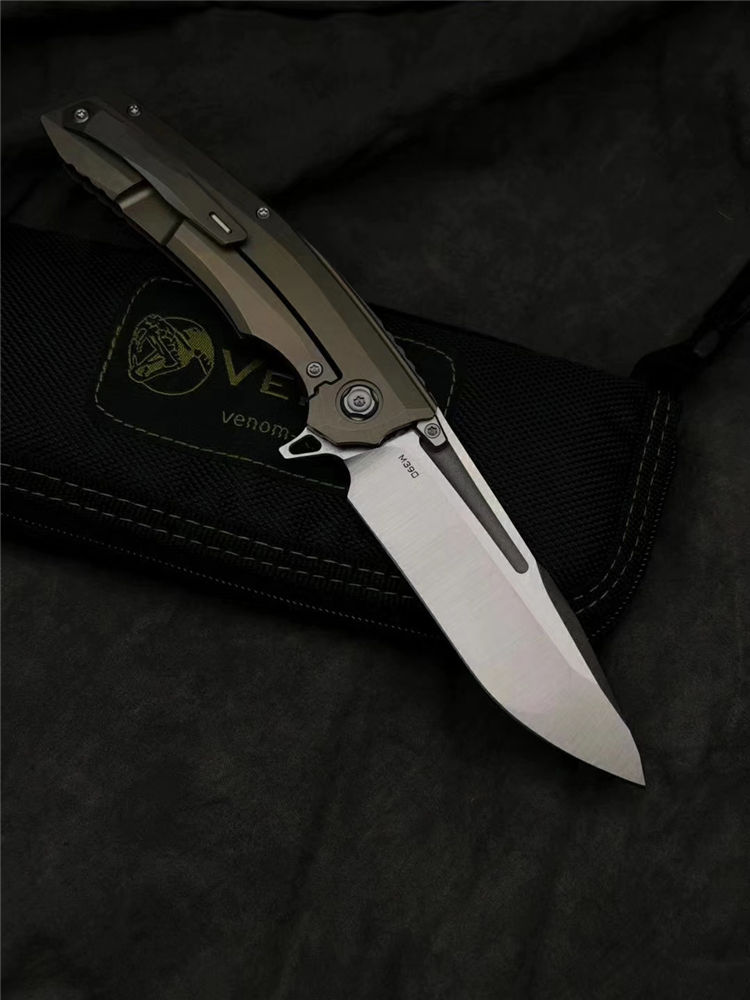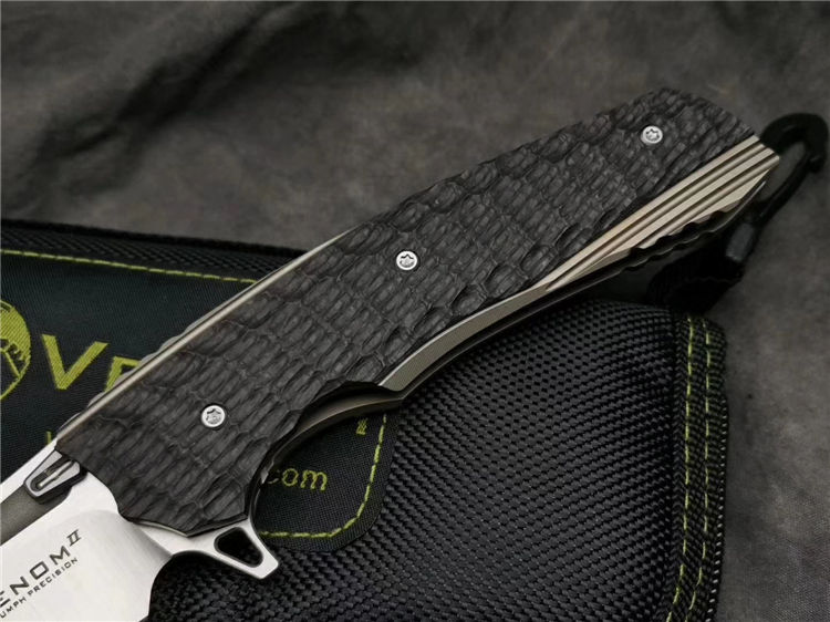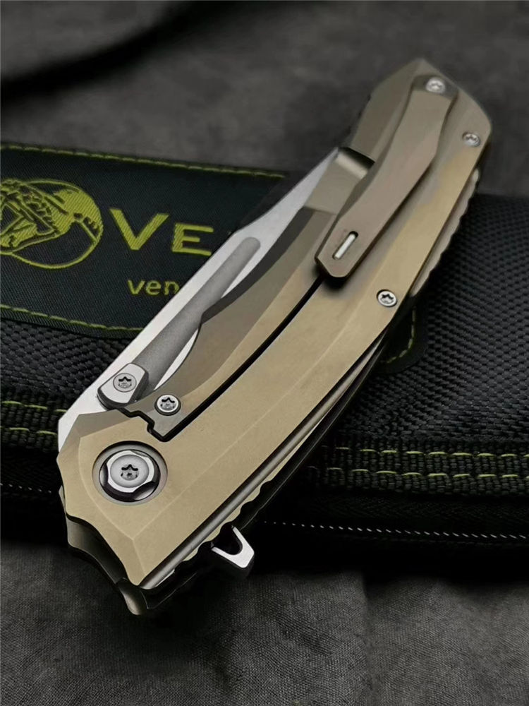 凯文毒液蟒蛇折刀 总长:215mm 刃长:95mm 刃厚:4mm 刃材:M390 硬度:60-62HRC 刀片研磨:凹面研磨 刀片处理:砂光/石洗 柄长:123mm 柄厚:18.1mm 柄材:钛合金+碳纤维 手柄处理:阳极氧化土豪金 夹子材料:钛合金+镶嵌氚气灯骶骨 材质:钛合金刀片 推钉:420镶嵌式氚气灯螺丝 材质:420垫圈 材质:陶瓷球轴承 重量:149克 锁类型:框架锁 标配:VENOM刀