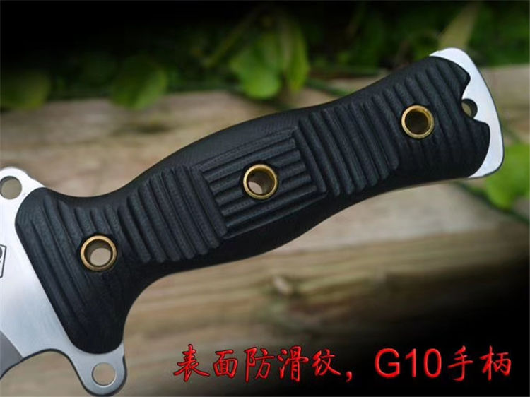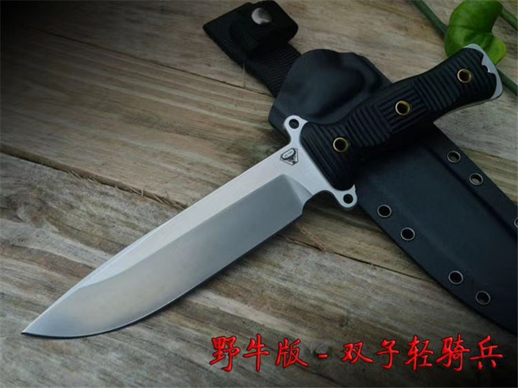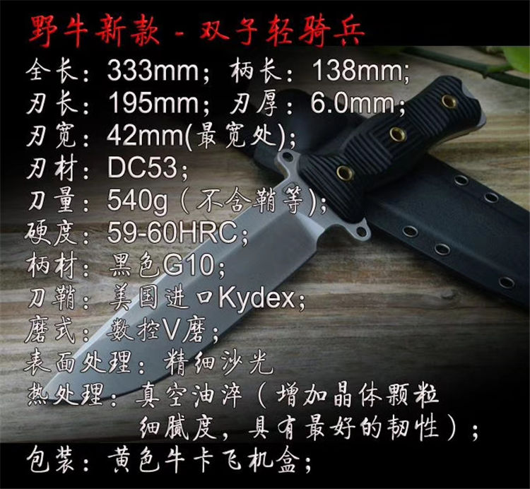 野牛版双子轻骑兵直刀 全长:333mm 柄长:138mm 刃长:195mm 刃厚:6.0mm 刃宽:42mm(最宽处) 刃材:DC53 刀重:540g(不含鞘) 硬度:59-60HRC 柄材:黑色G10 刀鞘:美国进口Kydex 磨式:数控V磨 表面处理:精细沙光 热处理:真空油淬(增加晶体颗粒细腻度,具有最好的韧性)