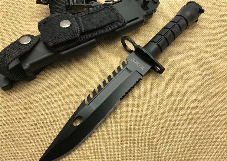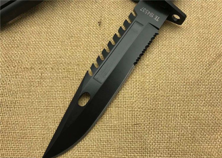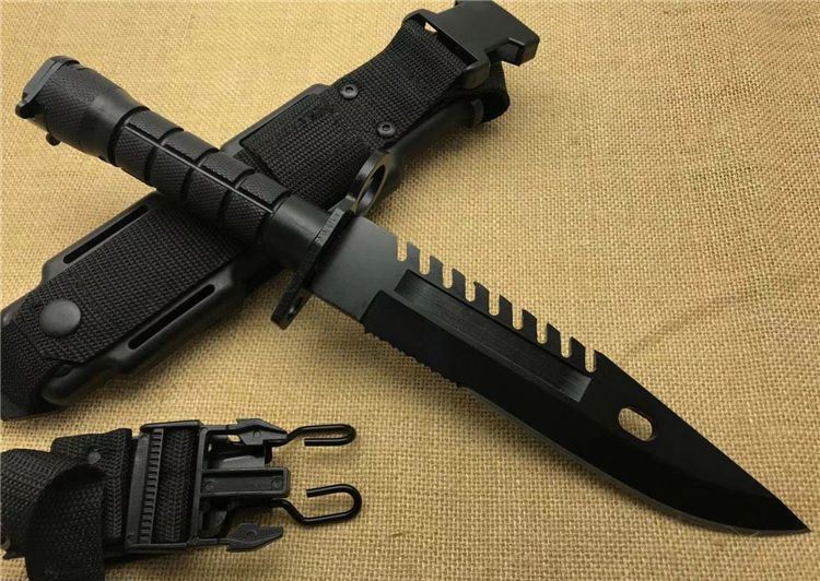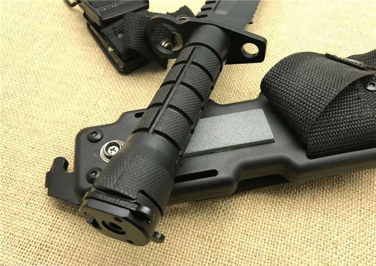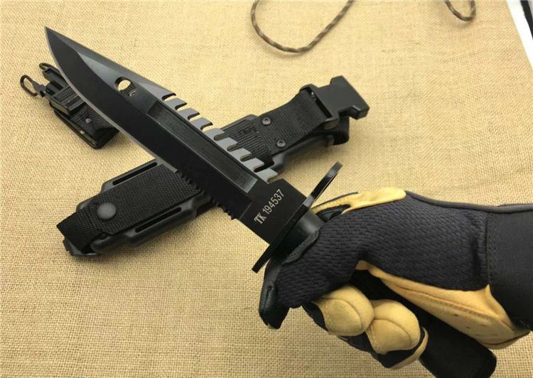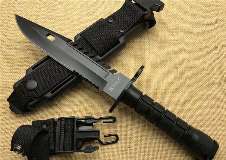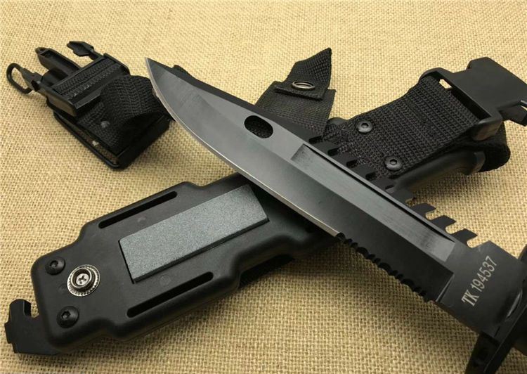 外贸全黑版D80(可拆卸)半齿 全 长: 32cm 刃 长: 19.8cm 刃 厚: 5.9mm 刃 材: 4CR13 硬 度: 56HRC 重 量: 刀410g+鞘380g 表 面: 发黑 柄 材: ABS 刀 鞘: ABS