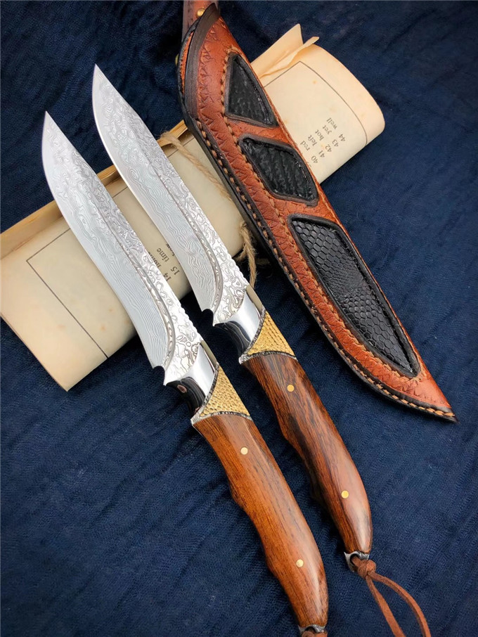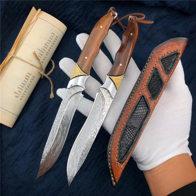 大马士革凤仙直刀 总长:23cm 刀刃:12cm 刃宽:2.1cm 厚度:3.1mm 钢材:进口大马士革钢 硬度:60HRC 开刃方式:二次开刃手工,真空热处理 手柄材质:白钢头+纯黄铜+美国砂铁木制造 包装:黑色手工盒