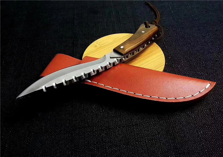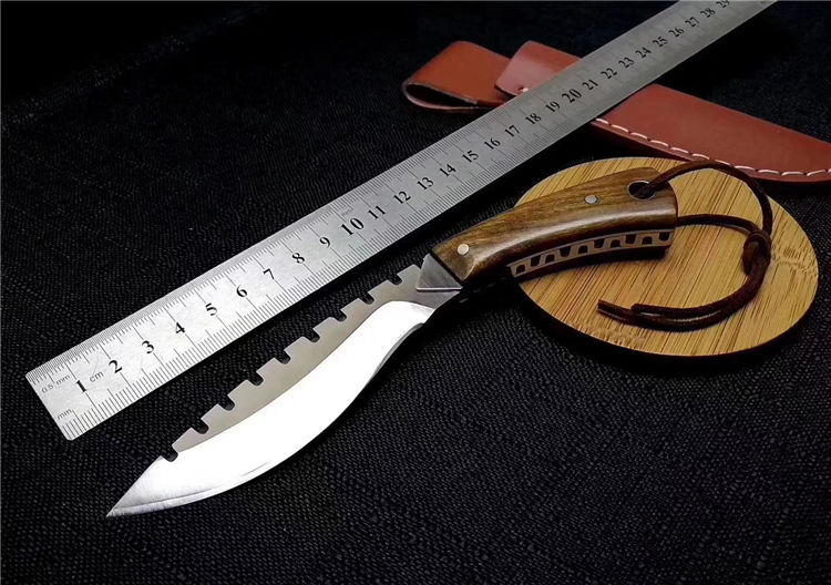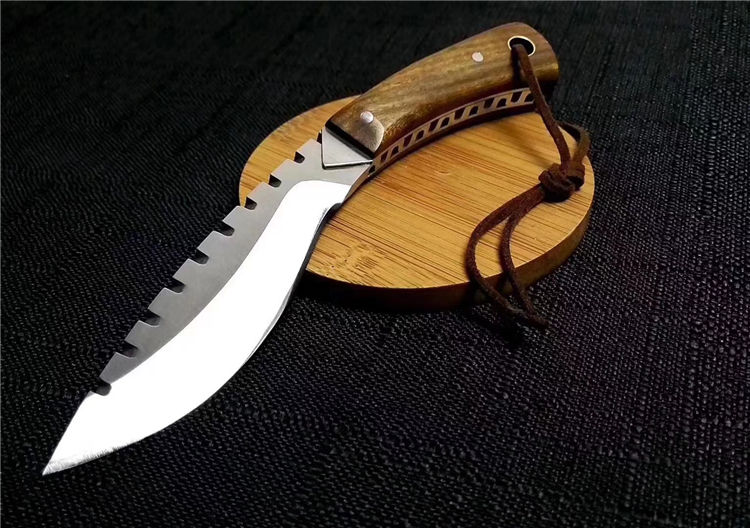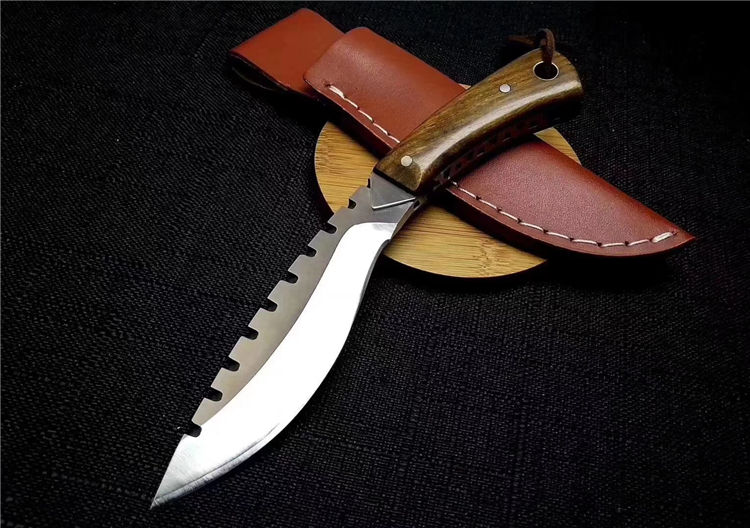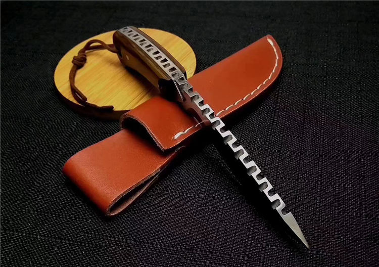 灵囚迷你狗腿弯刀 全长:19cm 刃长:9cm 柄长:9cm 刃厚:5.0mm 刃宽:2.5cm(最宽处) 刃材:7CR13MOV 硬度:58-59HRC 刀重:125克(含包装) 表面:镜光+拉丝 柄材:一体钢+黄梨木 刀鞘:牛皮套+纸盒