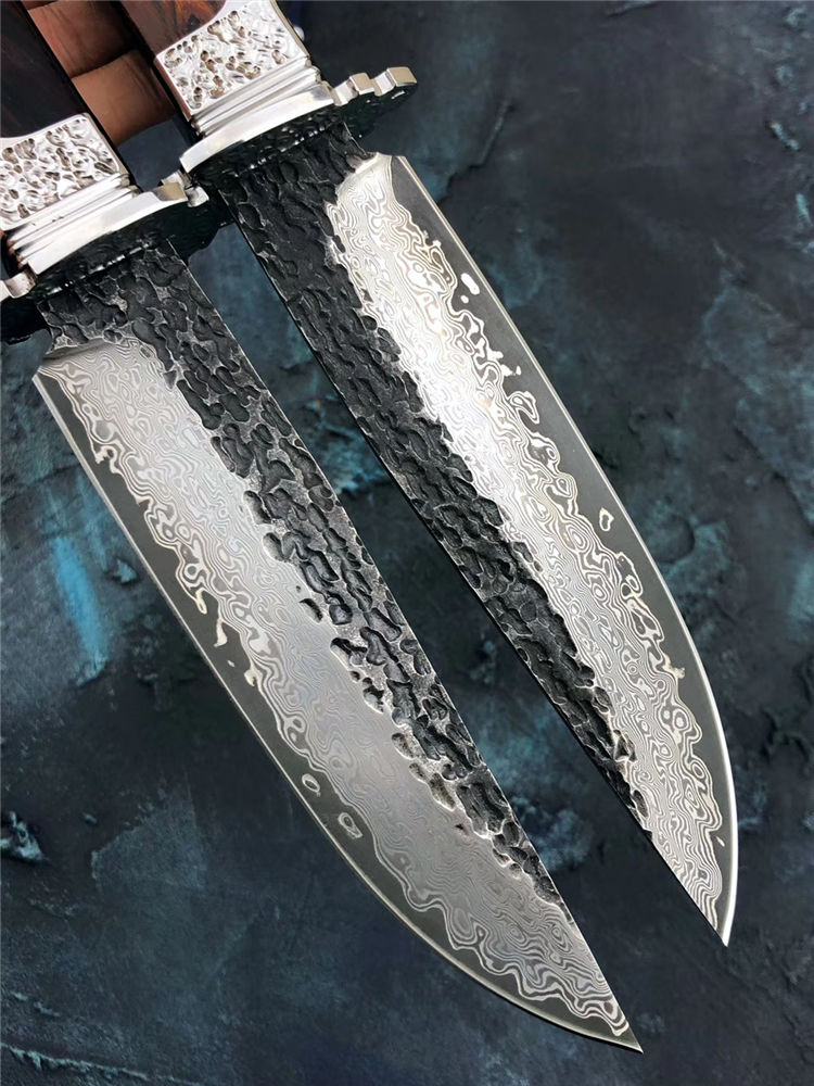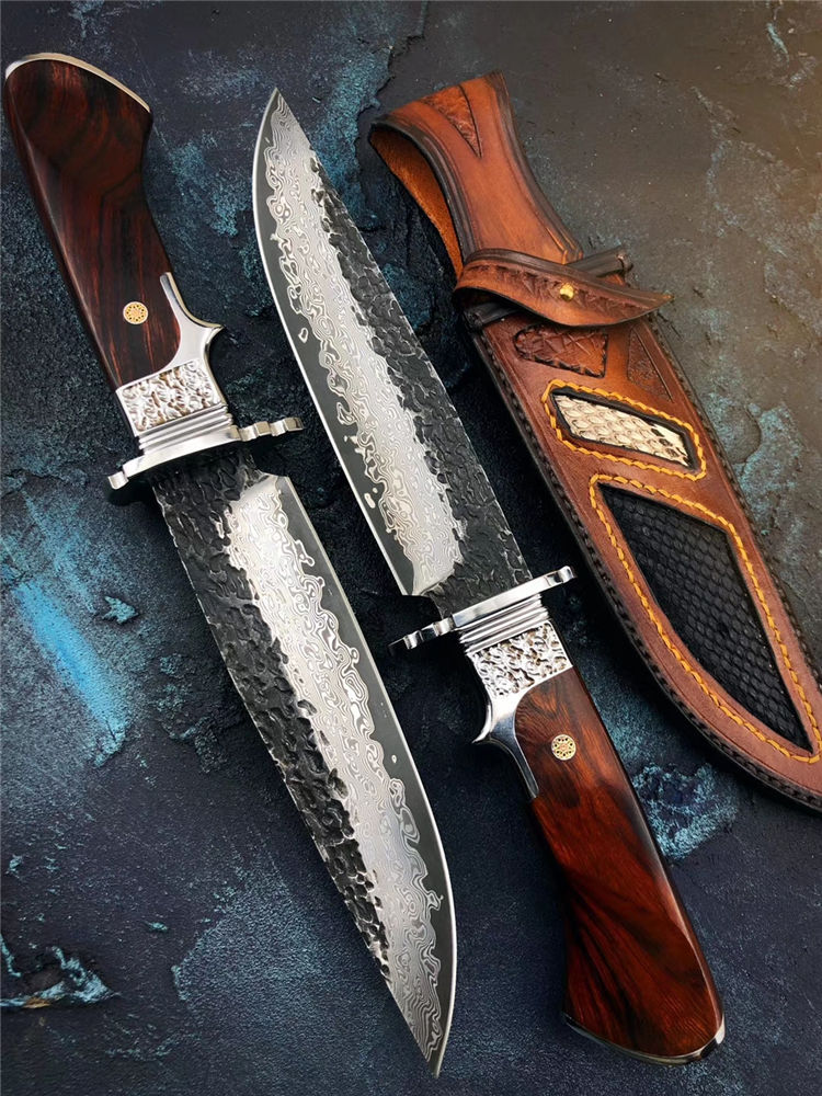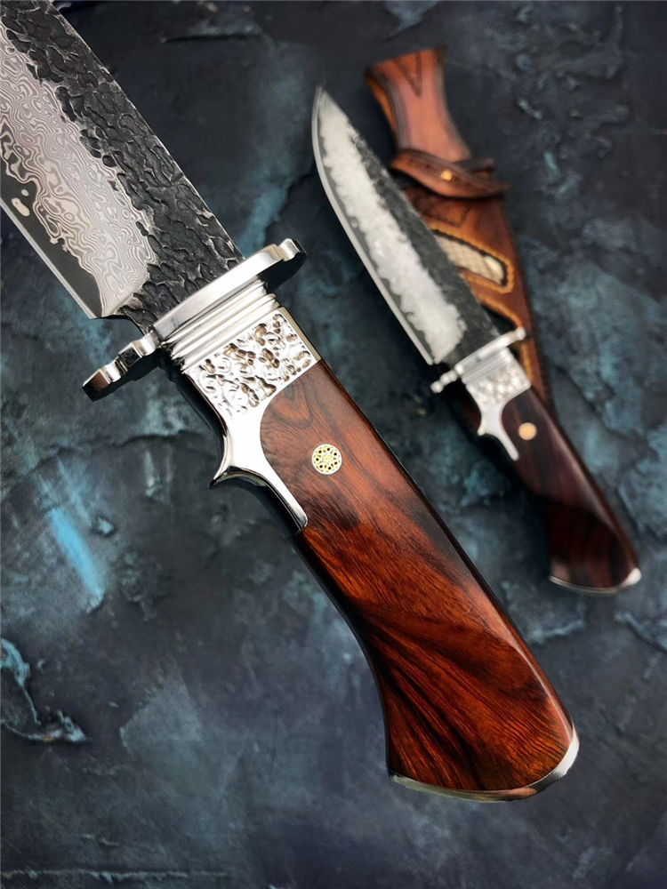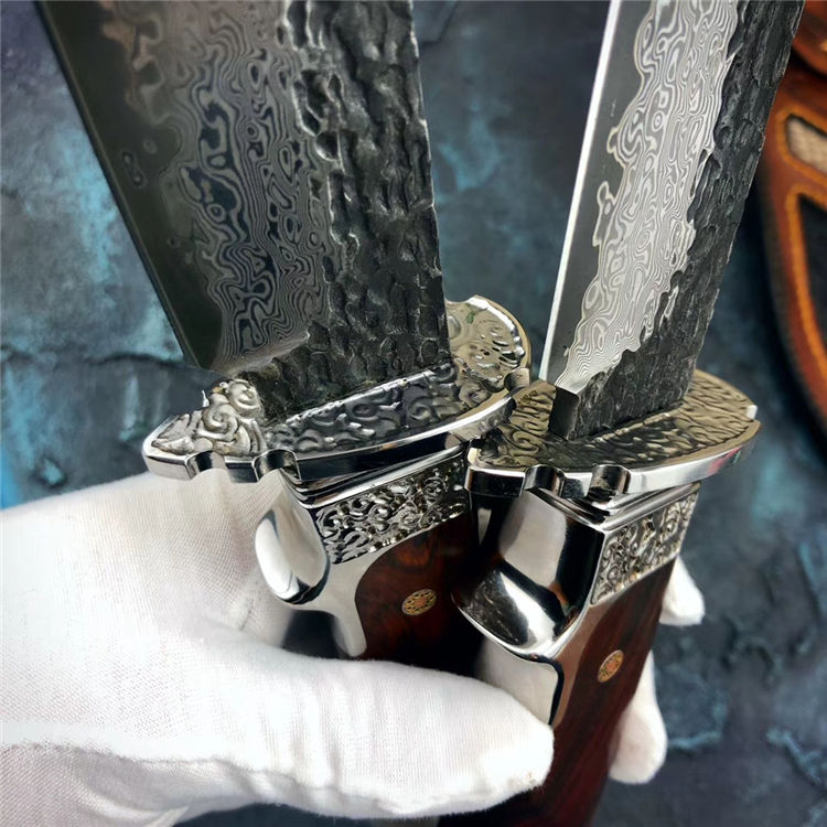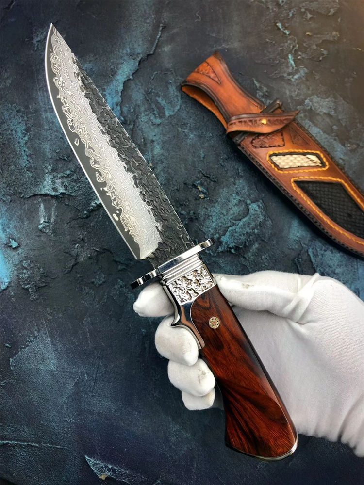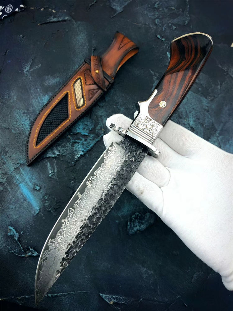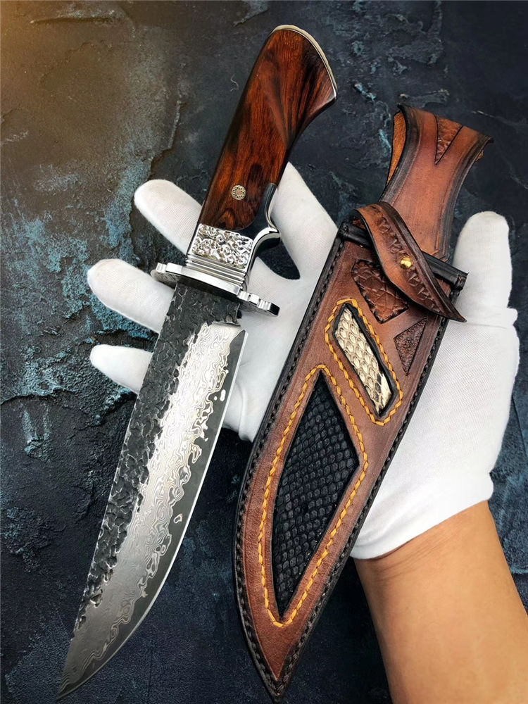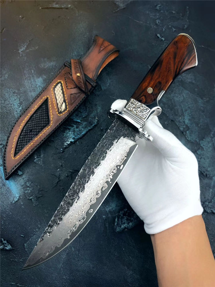 大马士革匠魂直刀 总长:28cm 刃长:15cm 手柄:12.5cm 宽:3.5cm 厚度:4mm 钢材:进口锻造大马士革钢 硬度:60HRC,真空高温热处理 柄材:不锈钢头雕刻腾云图腾+进口美国沙铁木 皮套:进口植鞣皮纯手工制作镶嵌蛇皮刀套 包装:黑色手工盒+皮套