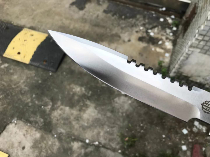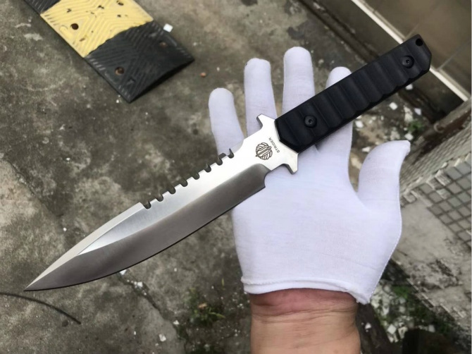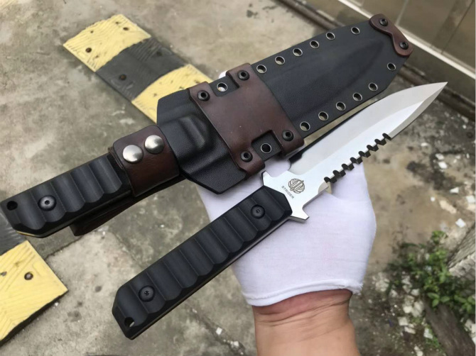 挺进者BT纪念版直刀 全长:32.5cm 刃长:16.7cm 柄长:13.5cm 刃厚:6mm 刃宽:3.6cm 钢材:DC53 硬度:60-61HRC 热处理:BOS专业真空热处理油淬 表面处理:精幼打磨钢本色效果 柄材:黑色复合G10材质 K鞘:进口K版+植鞣皮做旧效果 产地:中国代工