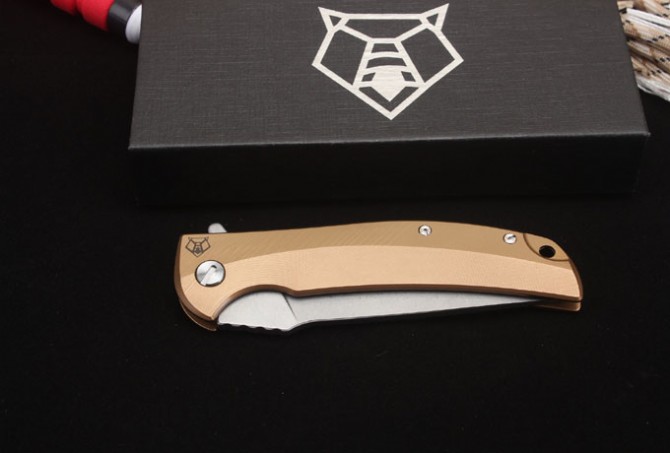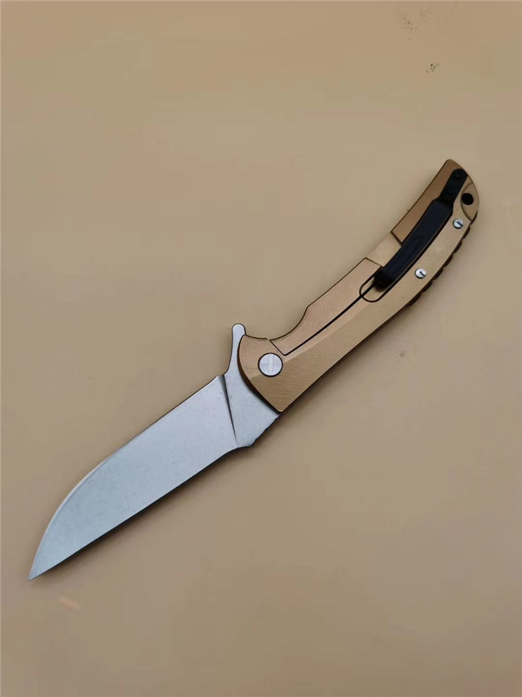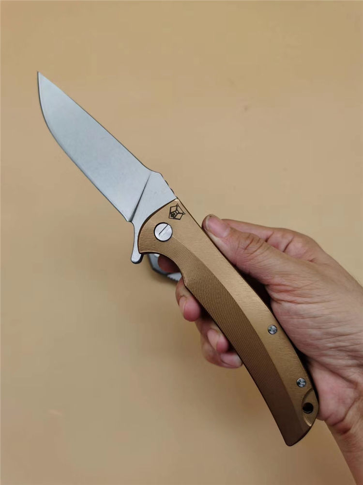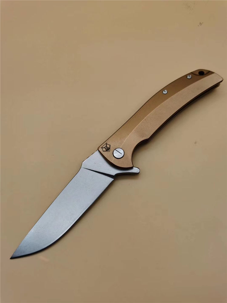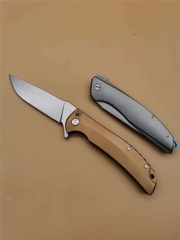 熊头全钢轴承折刀 总长:223mm 刃长:98mm 闭合长度:125mm 刃厚度:3.9mm 刀片表面处理:石洗 系统:滚珠轴承 刀重:161g 刀片材质:D2 手柄材质:全钢 硬度:58-59HRC