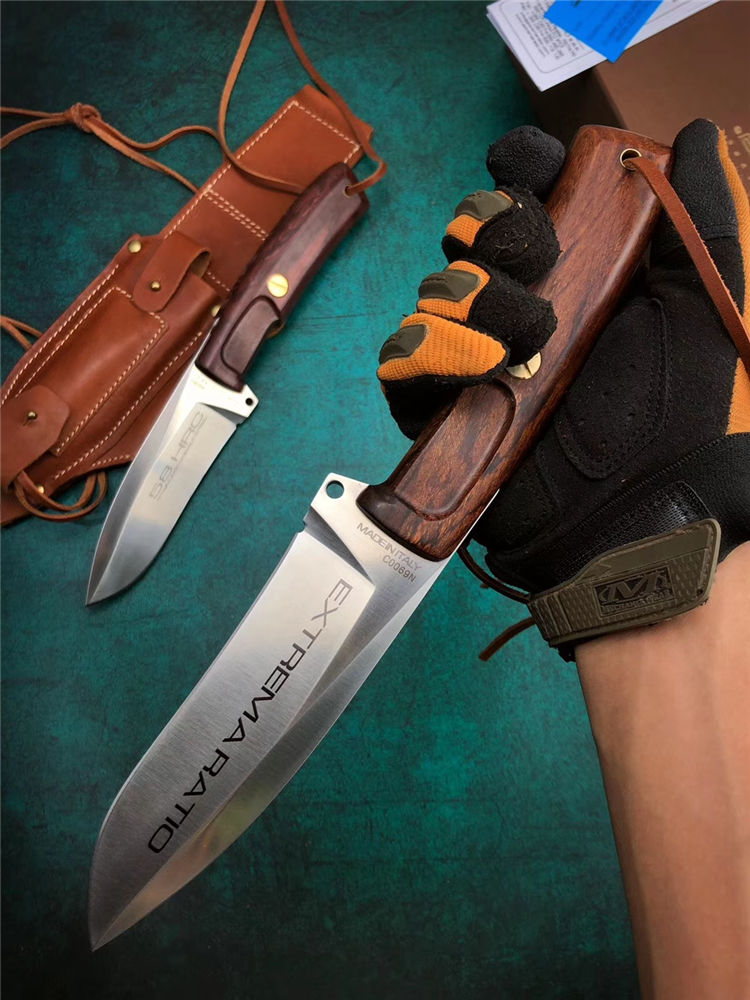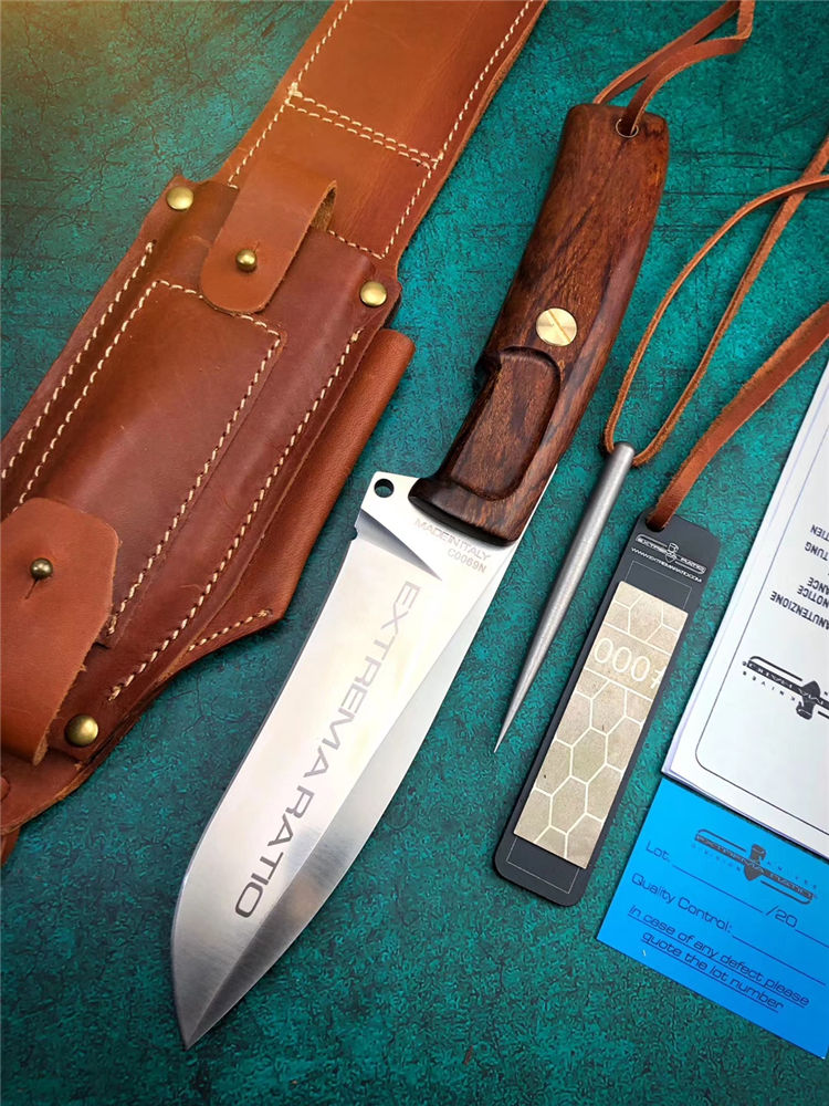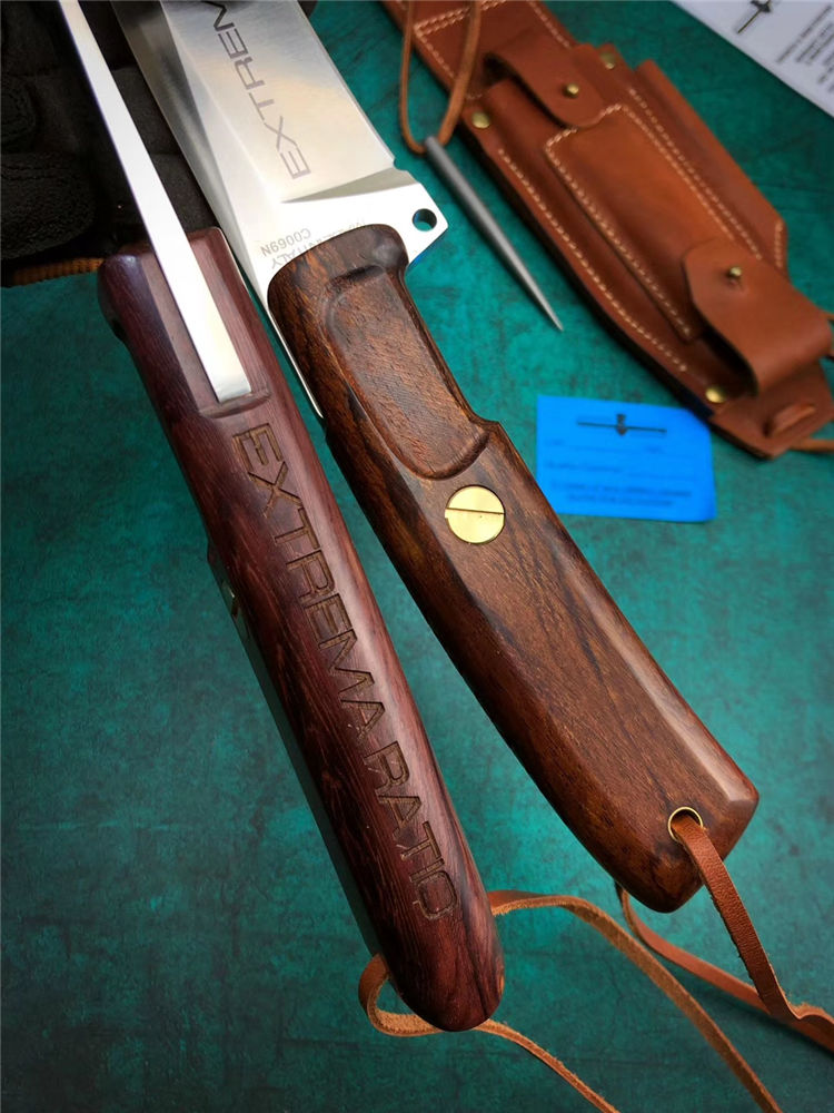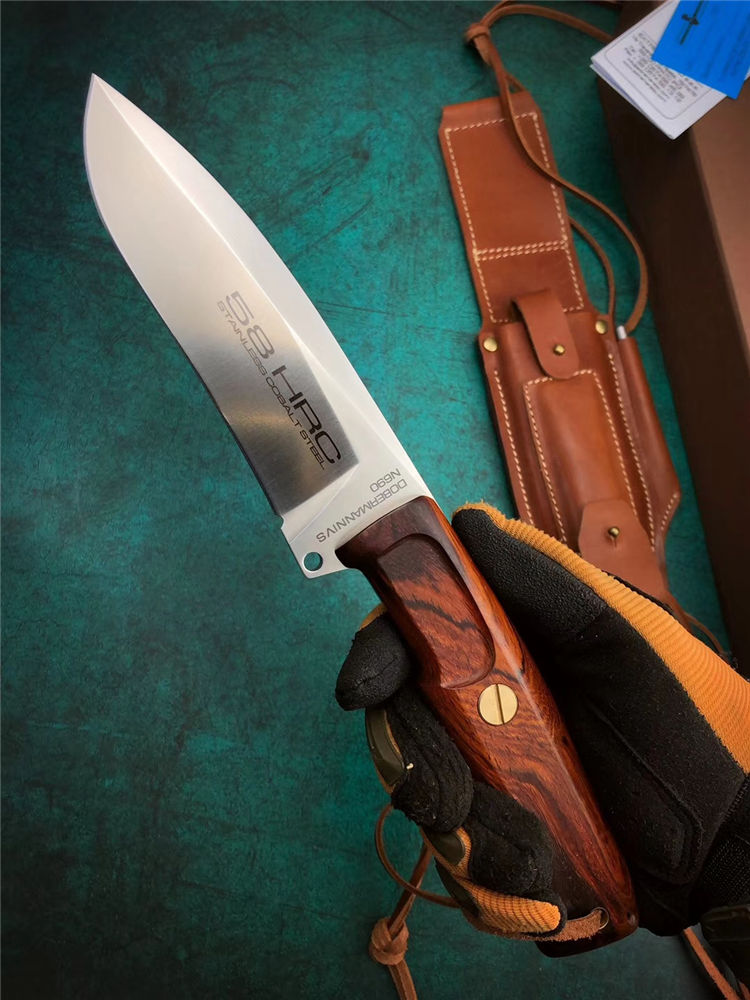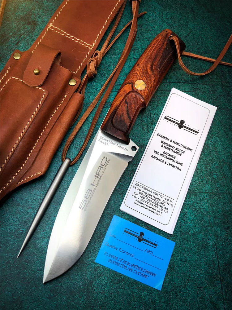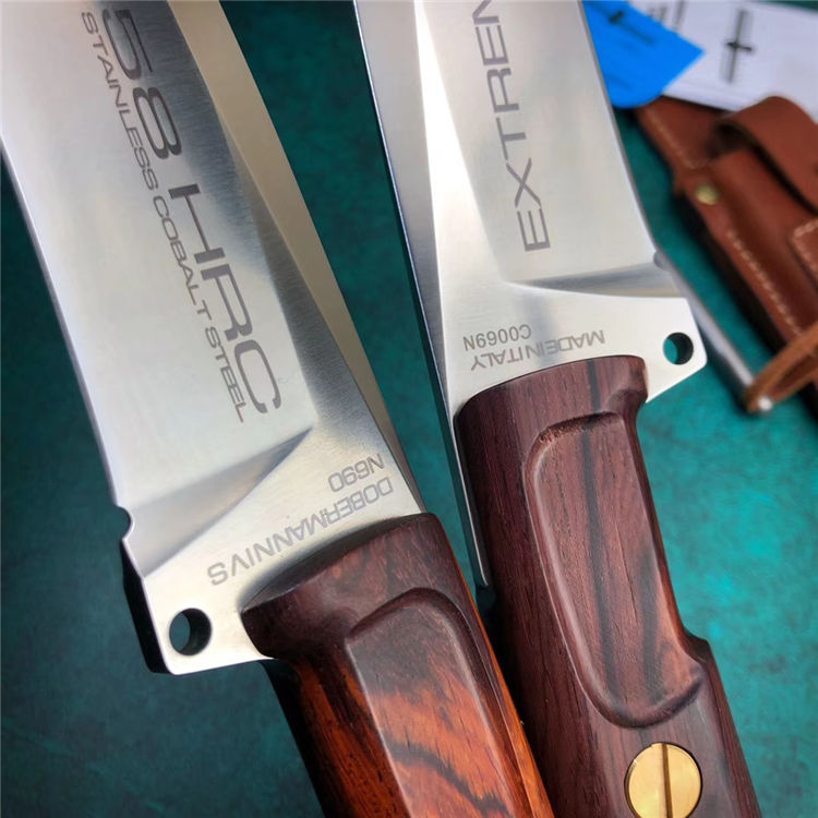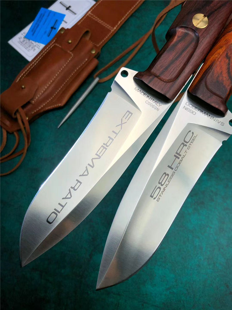 极端武力杜宾犬四代直刀 总长:29.4cm 刃长:14.3cm 刃材:BHLER N690 STEEL 硬度:58HRC 表面处理:缎面 刃宽:4.2cm 刃厚:6mm 柄材:桑托斯红木+纯黄铜钉固定 重量: 330g 皮套:意大利高级牛皮鞘+钢针+附带磨刀片 包装:原厂盒