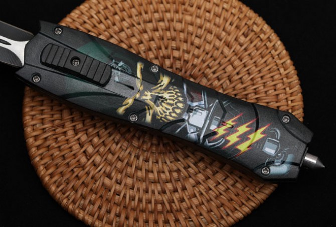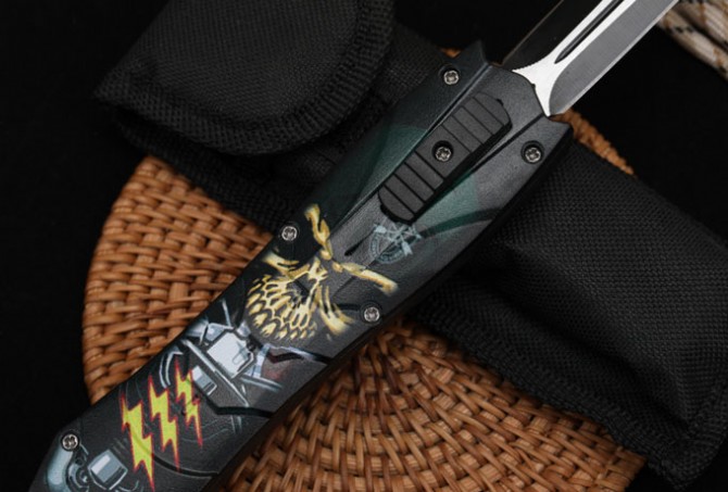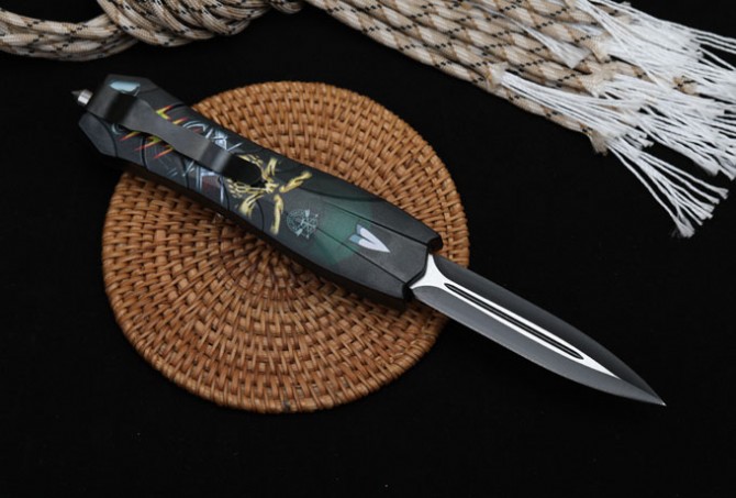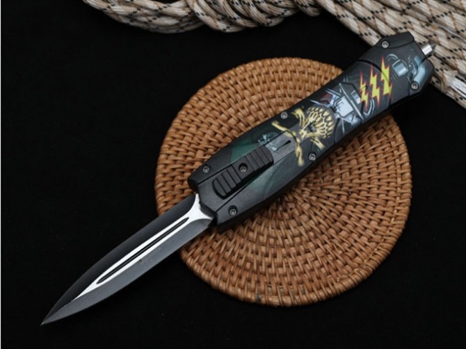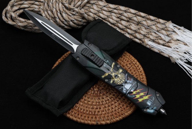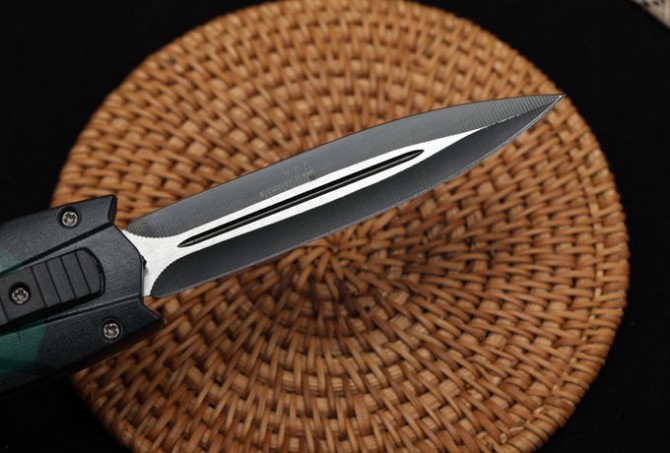 复仇者直出跳刀 全长:23cm 刃长:93mm 柄长:138mm 刃宽:18mm 刃厚:2.2mm 刃材:5Cr13Mov 硬度:57HRC 表面:拉丝+黑钛 柄材:ABS 锁型:直出