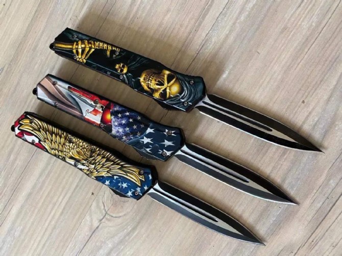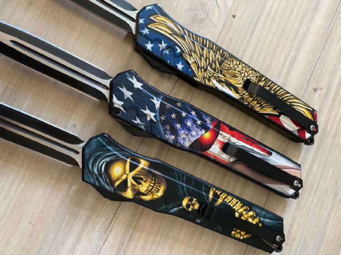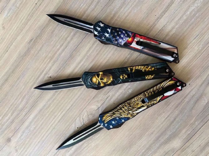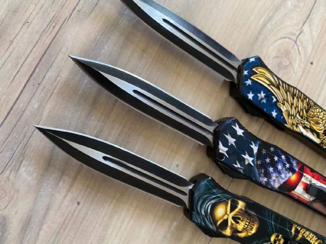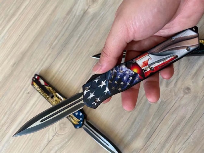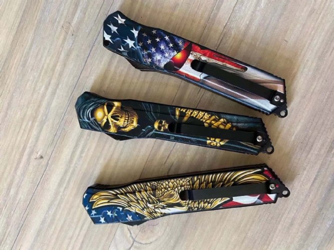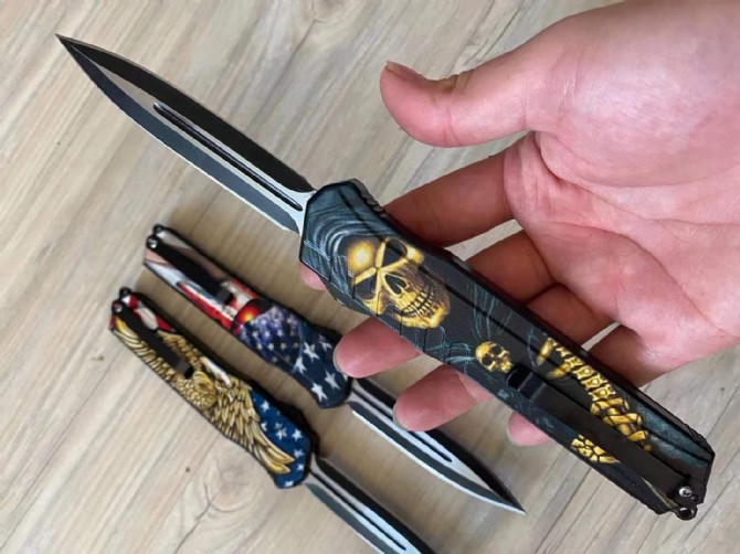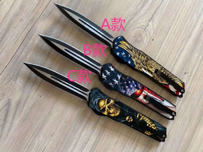 迷彩版暗码天启直出跳刀 总长度:248mm 刀片长度:100mm 刀片厚度:2mm 刀片宽度:20mm 手柄长度:140mm 手柄厚度:12mm 刀片材质:5CR13 硬度:57 表面处理3D打印