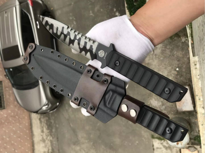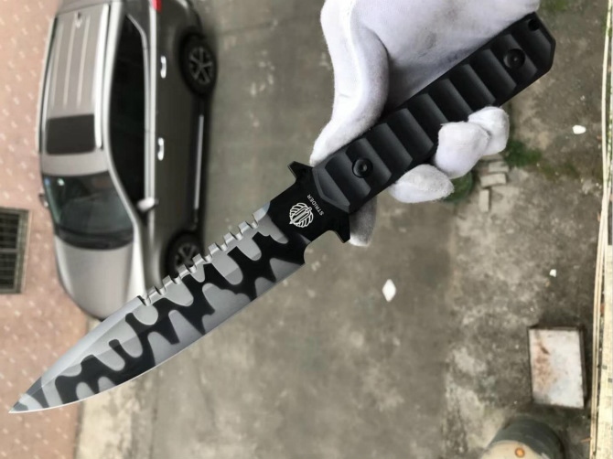 挺进者虎纹版BT纪念版直刀 全长:32.5CM 刃长:16.7CM 柄长:13.5 刃厚:6MM 刃宽:3.6CM 钢材:DC53 硬度:60-61HRC 热处理:BOS专业真空热处理油淬 表面处理:喷砂镀钛虎纹处理 柄材:黑色复合G10材质 K鞘:进口K版+植鞣皮做旧效果 产地:中国代工