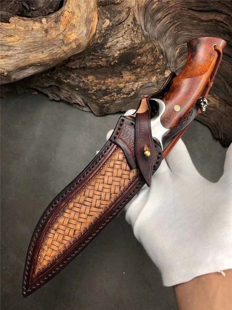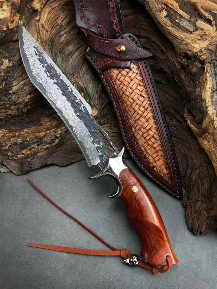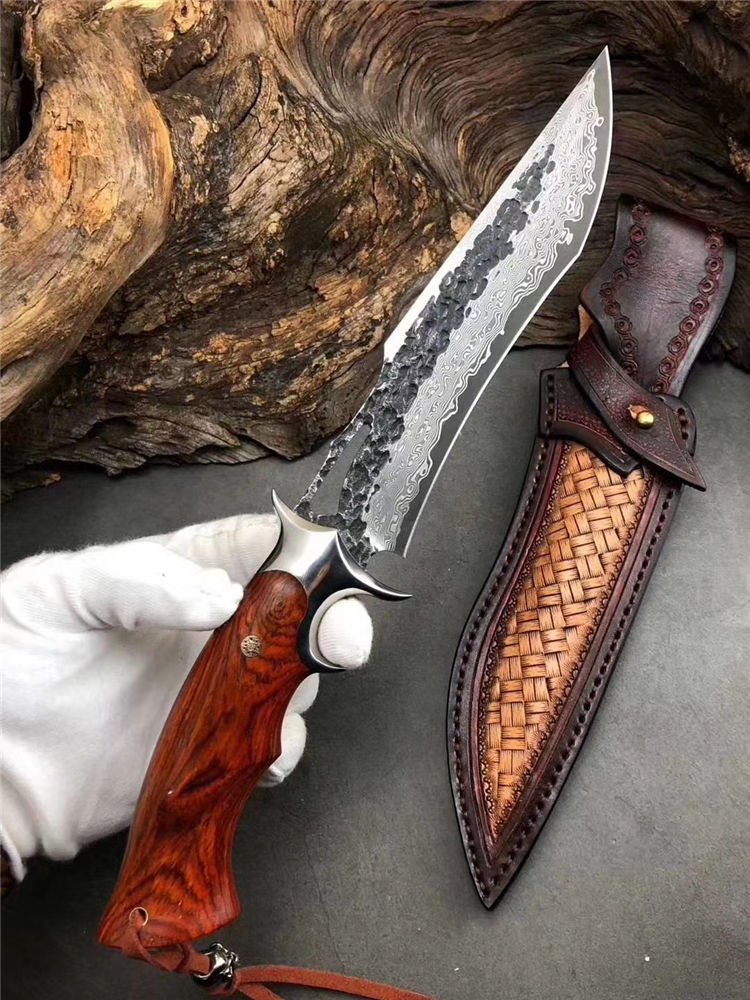大马士革天马博弈直刀 总长:31cm 刃长:17cm 柄长:13cm 刃宽:3.4cm 刃厚:5mm 钢材:进口锻造大马士革钢,表面原大马士革花纹保留锻打痕纹 柄材:不锈钢双环钢头+微粒黄檀木 包装:手工黑色盒