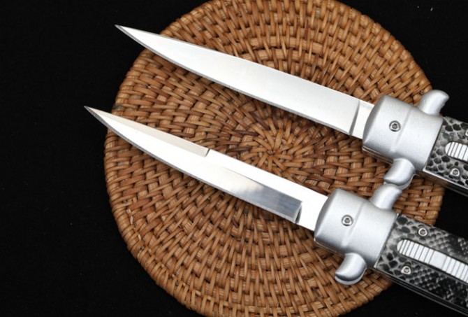 AKC直出跳刀 全长:22.5cm 刃长:9.5cm 厚:3mm 材:D2 硬度:59HRC 重:204g 毛重:287g 表面:镀钛 柄材:锌铝合金+亚克力 鞘:尼龙 锁 闭:直出弹簧刀
