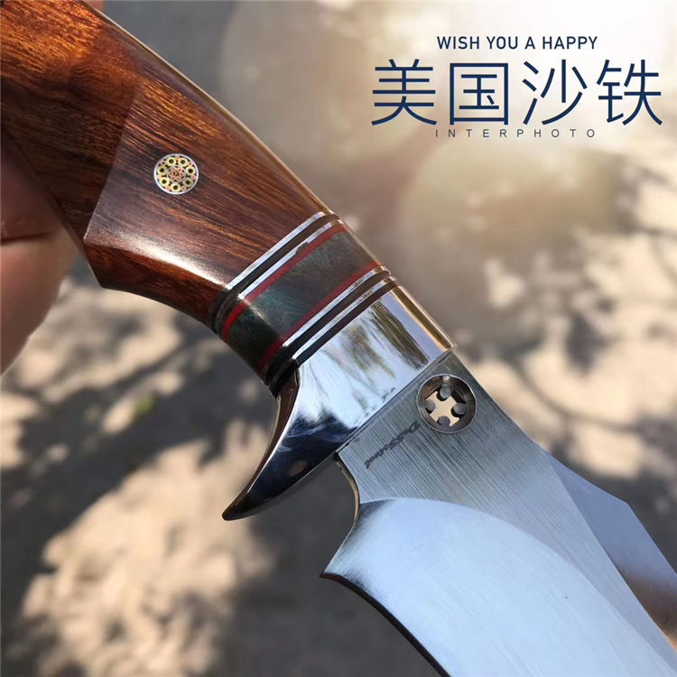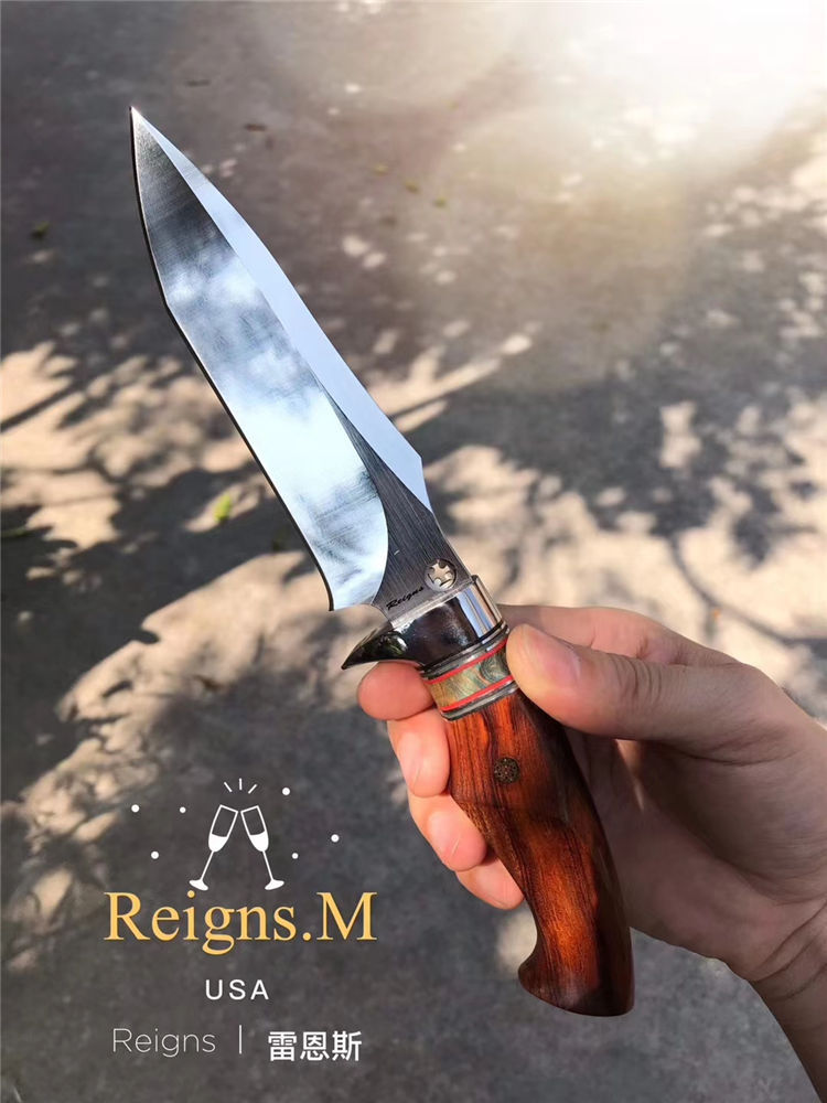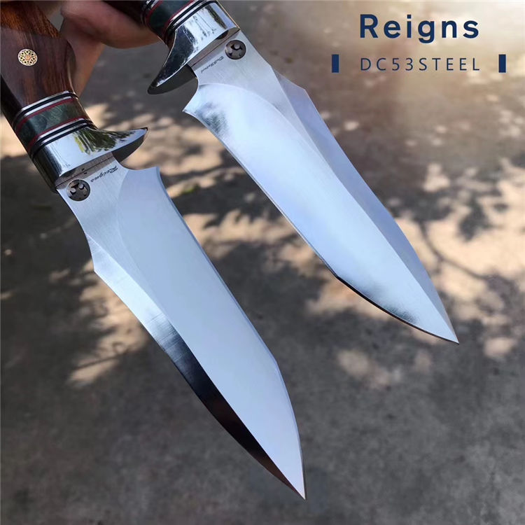 罗曼.雷恩斯直刀 总长:25cm 刃长:12.3cm 刃厚:4MM 刃宽:3.5cm 钢材:进口DC53合金模具钢 硬度:60-62HRC 热处理:真空热处理 表面效果:半镜光+拉丝 柄材:美国沙漠铁木+稳定木+垫片钢头 皮套;意大利进口植鞣皮,手工复棕色雕花皮套 包装;复古手工盒子
