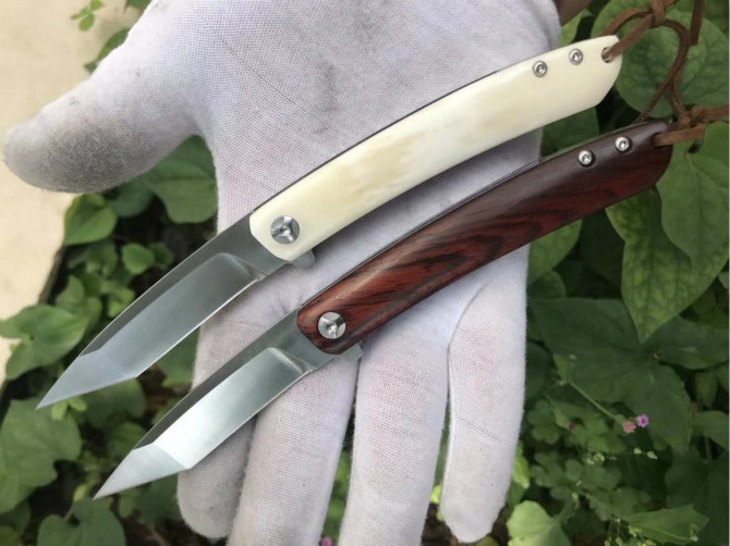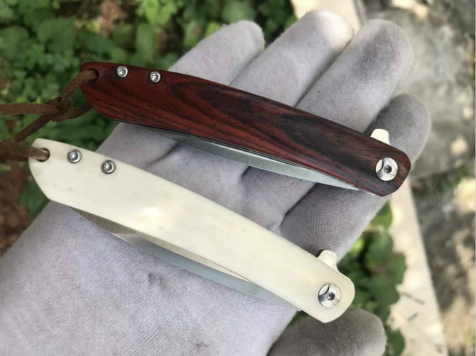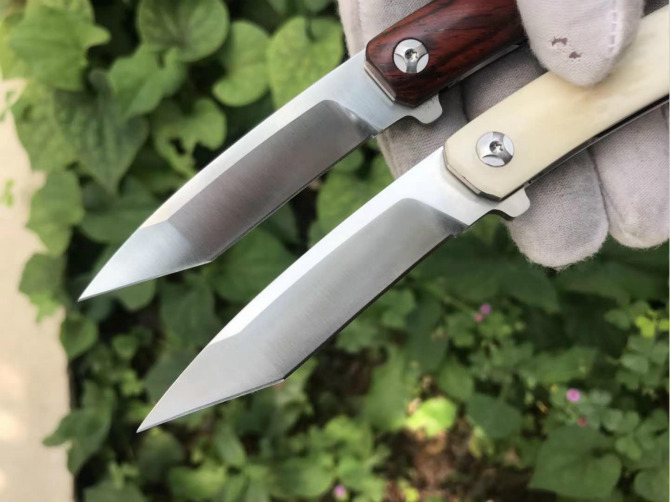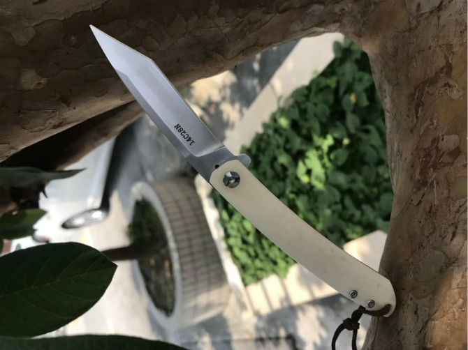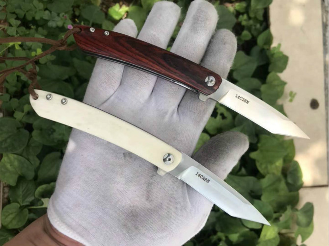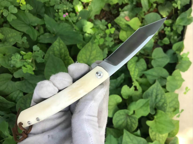 简易必杀折刀 全长:17.5cm 刃长:7cm 柄长:10cm 刃宽:1.7cm 刃厚:3.5mm 刃材:14C28N(刀刃数控磨工处理) 刀重:80G 硬度:60HRC 表面:刀刃真空处理,精细沙光 柄材:老牛骨,黄檀木 结构:线锁结构、轴承 其他:礼品盒装