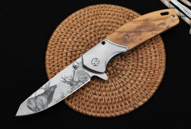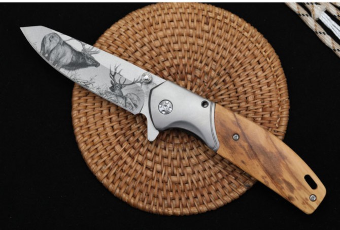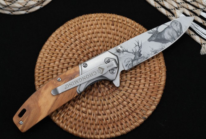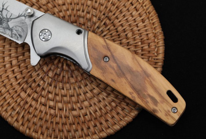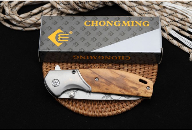 创名CM98快开折刀 刃长:8.8cm 柄长:11.5cm 刃宽:2.4cm 刃厚:3.2mm 刃材:440 重量:172(含包装) 硬度:57HRC 表面:3D打图, 柄材:钢片+天然橄榄木柄,木纹清晰。 锁型:线锁 其他:配厂盒