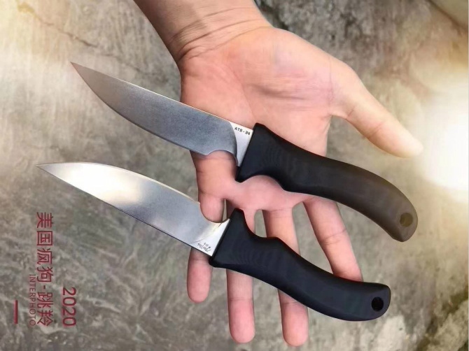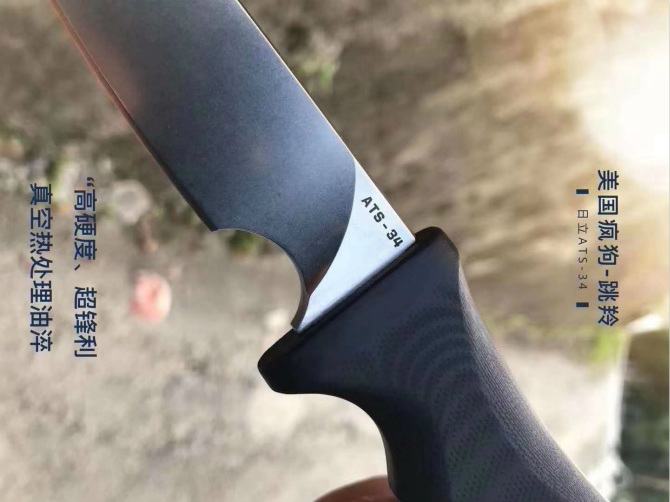 美国疯狗跳羚直刀 总长:22CM 刃长:9CM 刃厚:5MM 刃宽:2.3CM 重量:146G 钢材:日本日立公司ATS-34合金不锈钢 硬度:60-62HRC ,硬度韧性非常好 热处理:真空热处理,3次低温回火 柄材:黑色复合G10材质 结构:一体龙骨结构入柄内,G10复合材质包钢、不用担心断裂情况 表面效果:石洗效果 开刃方式:水冷多次开刃 刀套:进口K 鞘 包装:简包纸盒包装