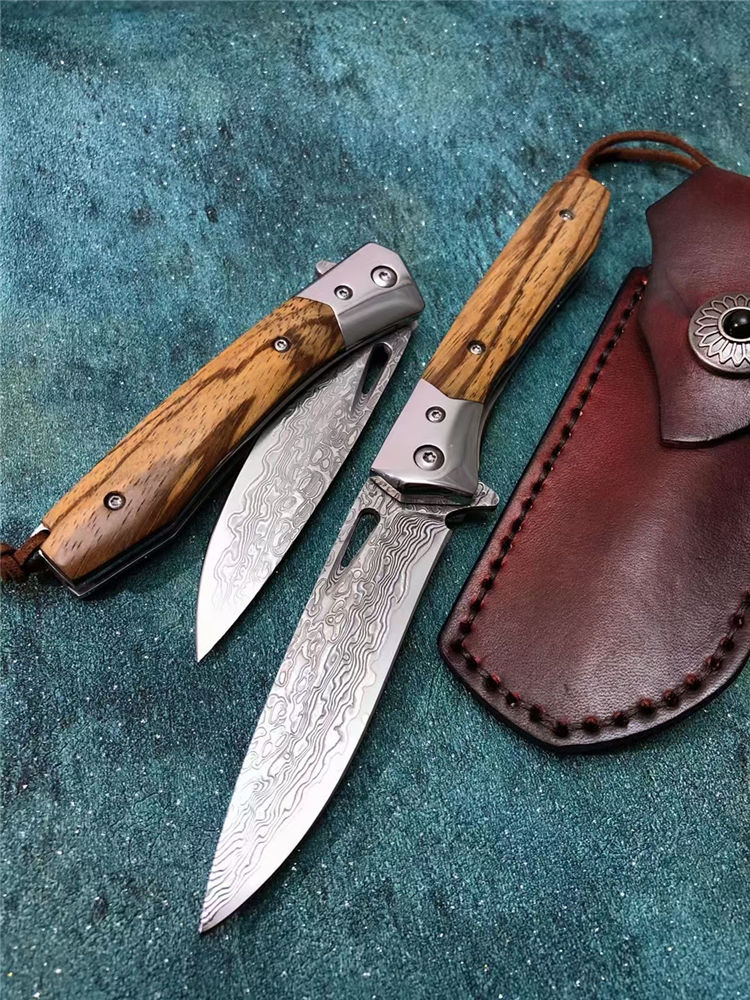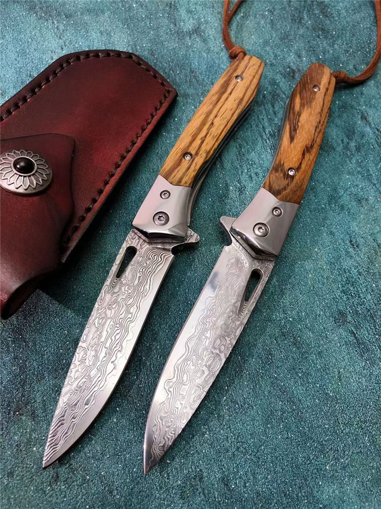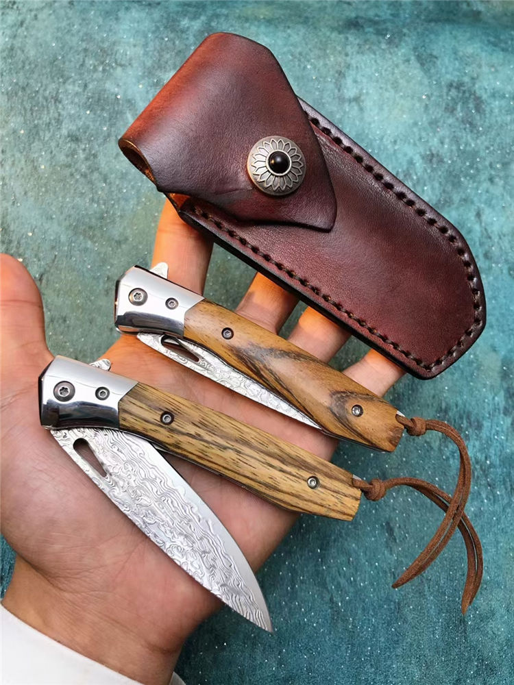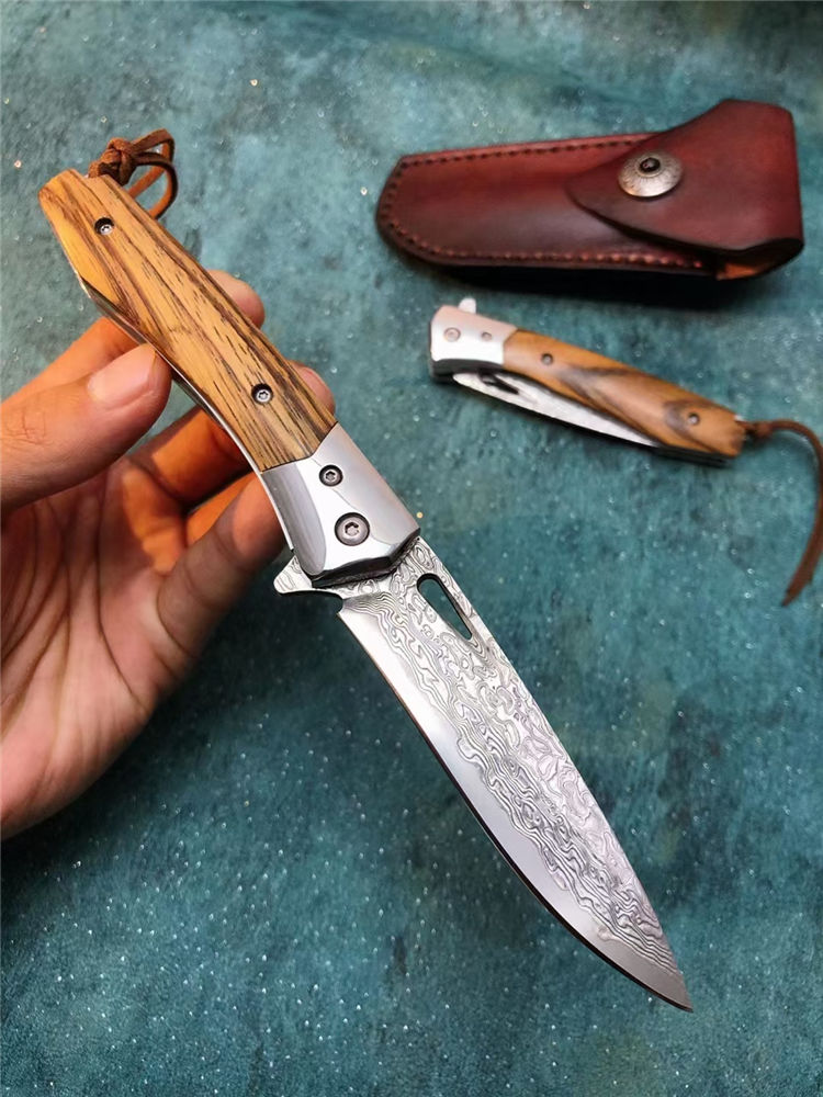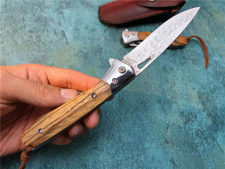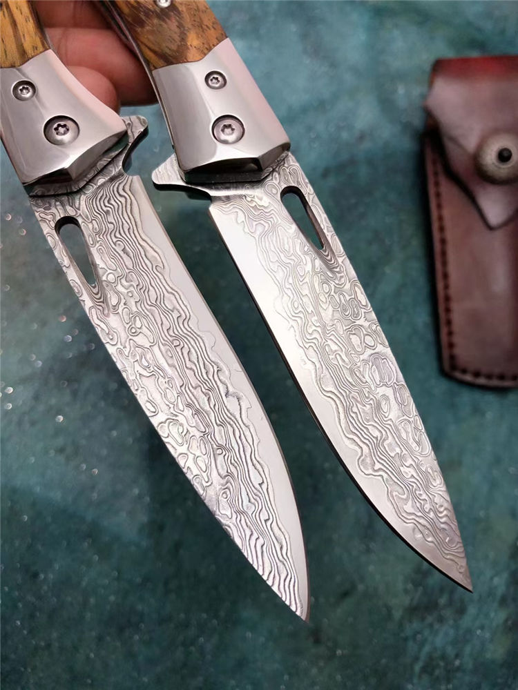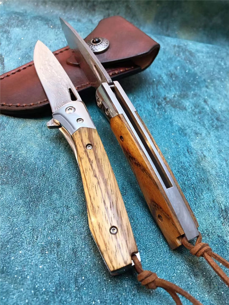 大马士革战影折刀 总长:19.5cm 刃长:8.6cm 刃宽:2.1cm 刃厚:3.3MM 钢材:VG10芯层大马士革钢,真空深冷热处理,硬度59HRC 开合方式:单手轴承快开 轴承:进口滚珠轴承 钢头:进口67层大马士革钢 柄材:名贵黑胡桃蛇纹木 背骨雕花,配皮绳子 皮套:进口植鞣皮手工缝线 盒子:硬盒子礼盒包装 一款是高端名贵收藏级玩家必备用战术折刀,送朋友领导必备品,高端好东西不要错过