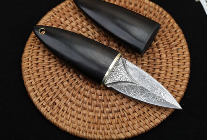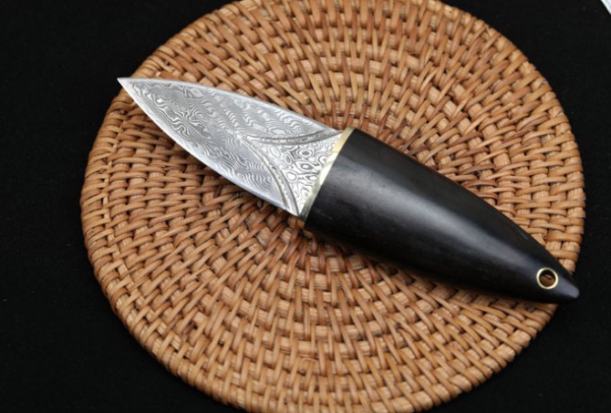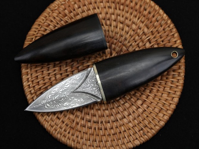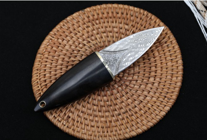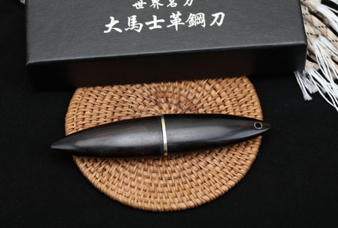 大马士革橄榄刀 闭合长度:14.3cm 全长:12.8cm 刃长:5.8cm 柄长:7.0cm 刃厚:0.28cm 重量:105g含包装 刃材:大马士革钢 硬度:59HRC 黑檀木礼品盒布袋