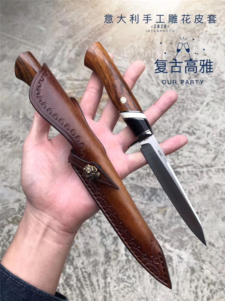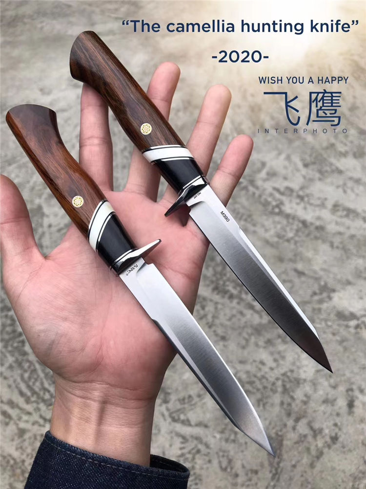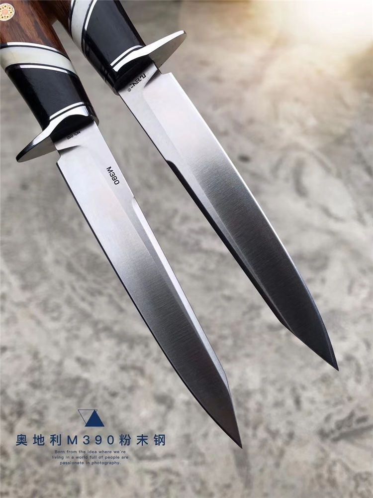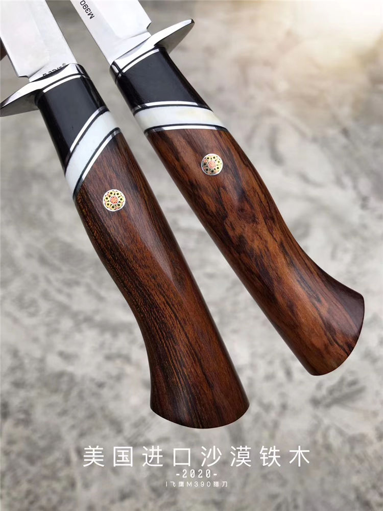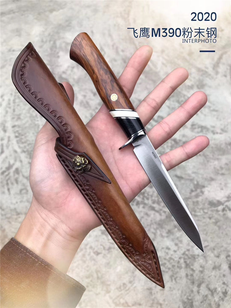 M390飞鹰直刀 总长:22.8cm 刃长:11cm刃 刃宽:1.8cm 刃厚:3mm 钢材:奥地利进口M390粉末钢(神钢)支持专业光谱钢材化验 柄材:进口美国沙漠铁木+牛骨+黑檀木 硬度:60-62HRC,上海专业真空深冷油淬热处理,锋利度极好 皮套:阿根廷进口纯手工缝线雕花植鞣皮 包装:复古硬礼盒包装