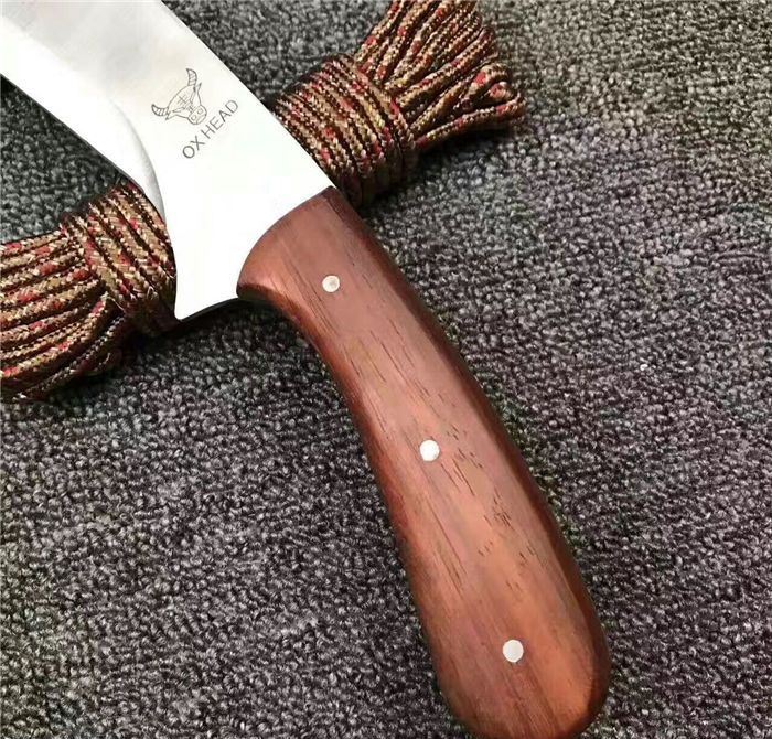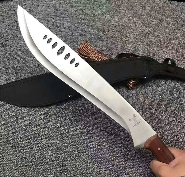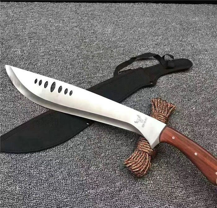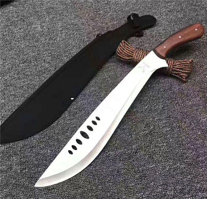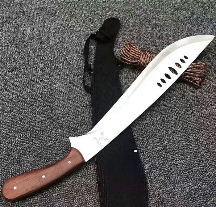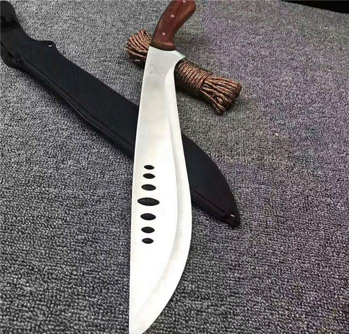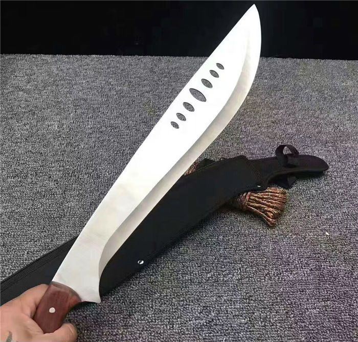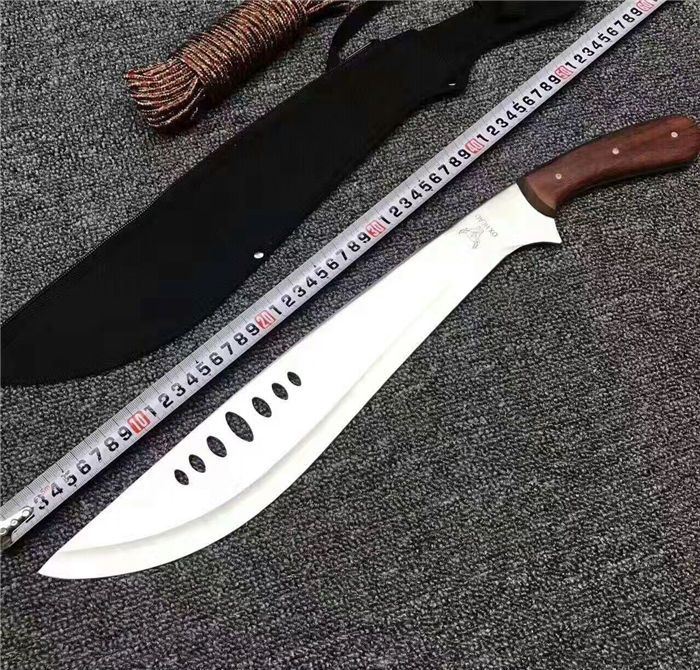 全 长:53cm 刃 长:39cm 柄 长:14cm 刃 厚:27mm 刃 宽:6.5cm 刀 重:520g 合 重:560g(连刀套) 钢 材:440 柄 材:彩木