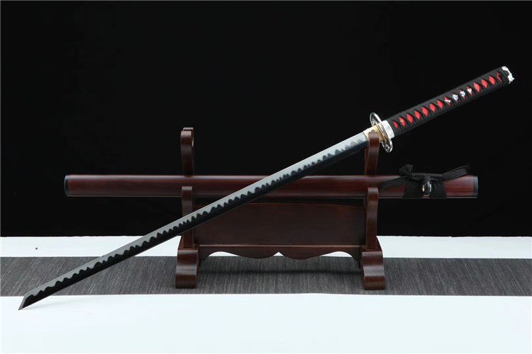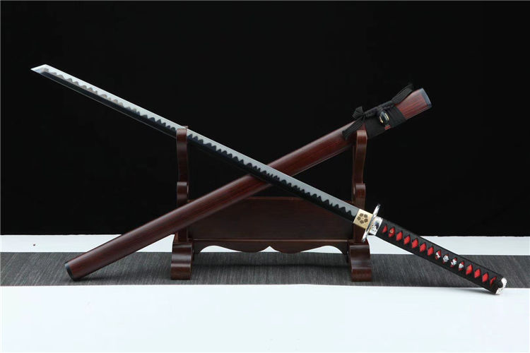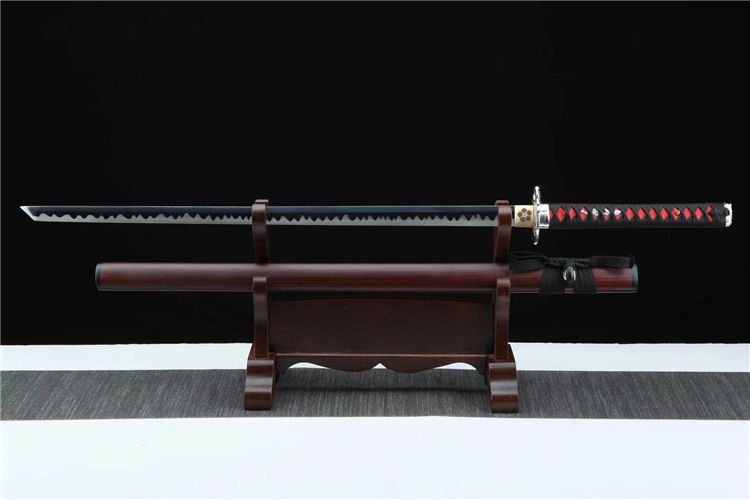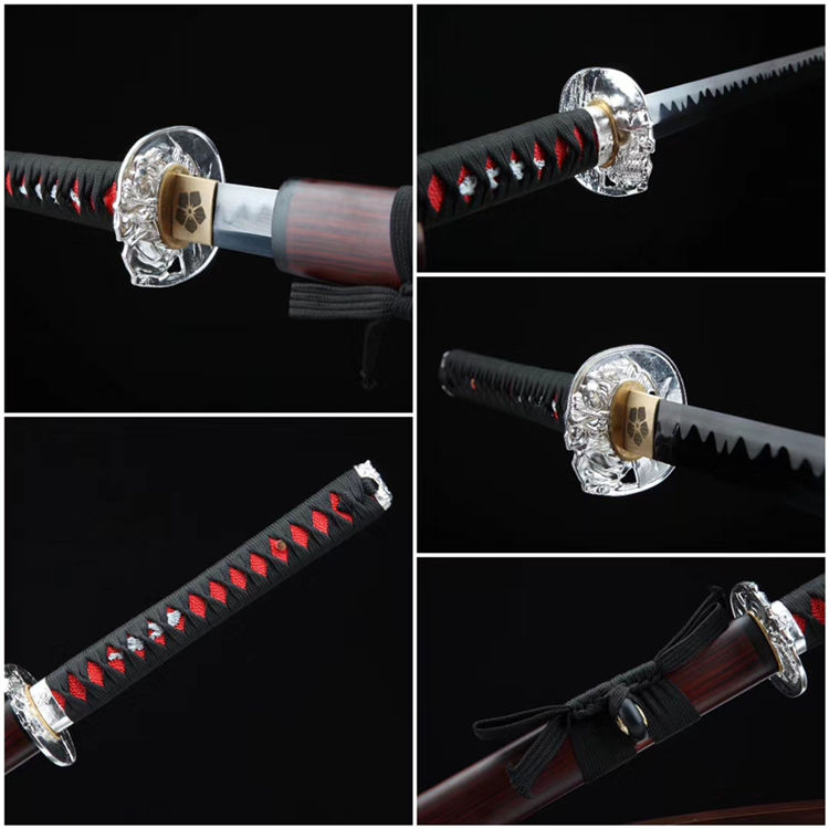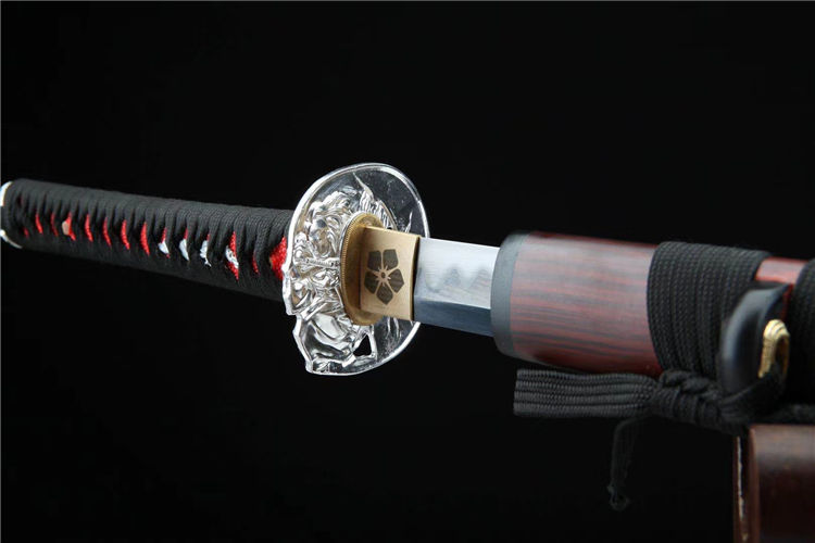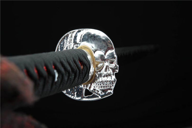 骷髅武士刀 工艺:龙泉古法传统手工艺 装具:合金装 刃材:高性能猛钢推磨 柄材:拆装裹绳柄 鞘材:实木漆鞘 赠品:精美锦盒、养护油、布、等