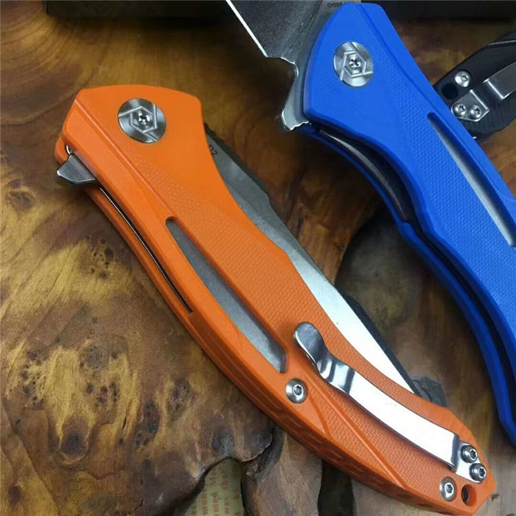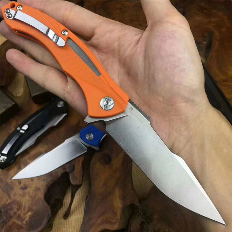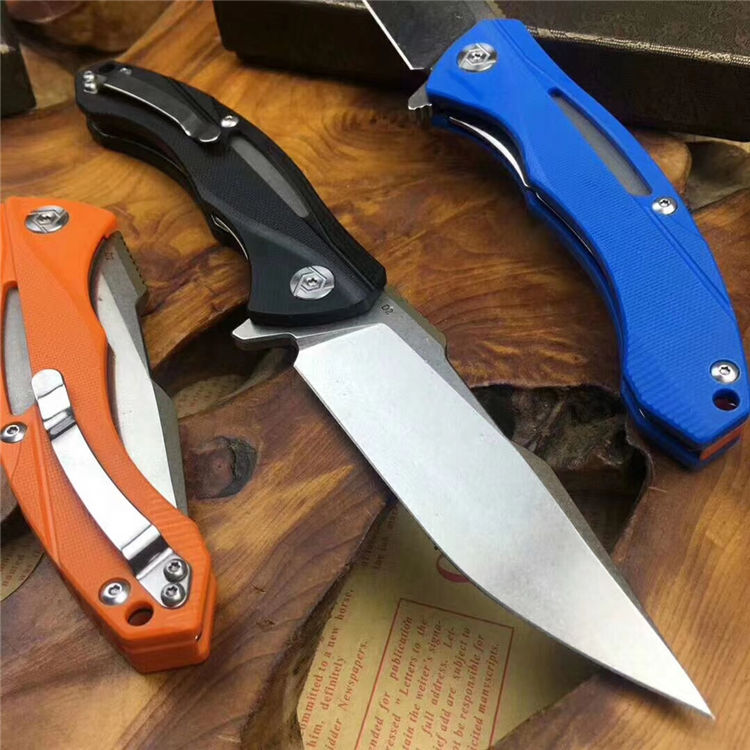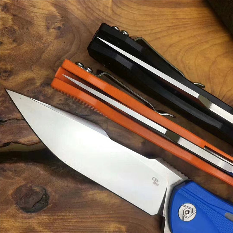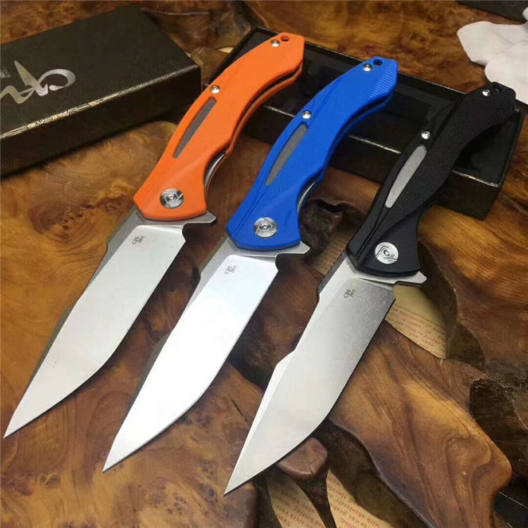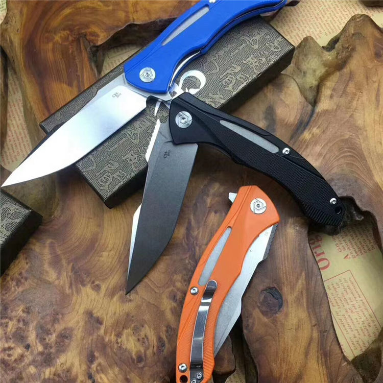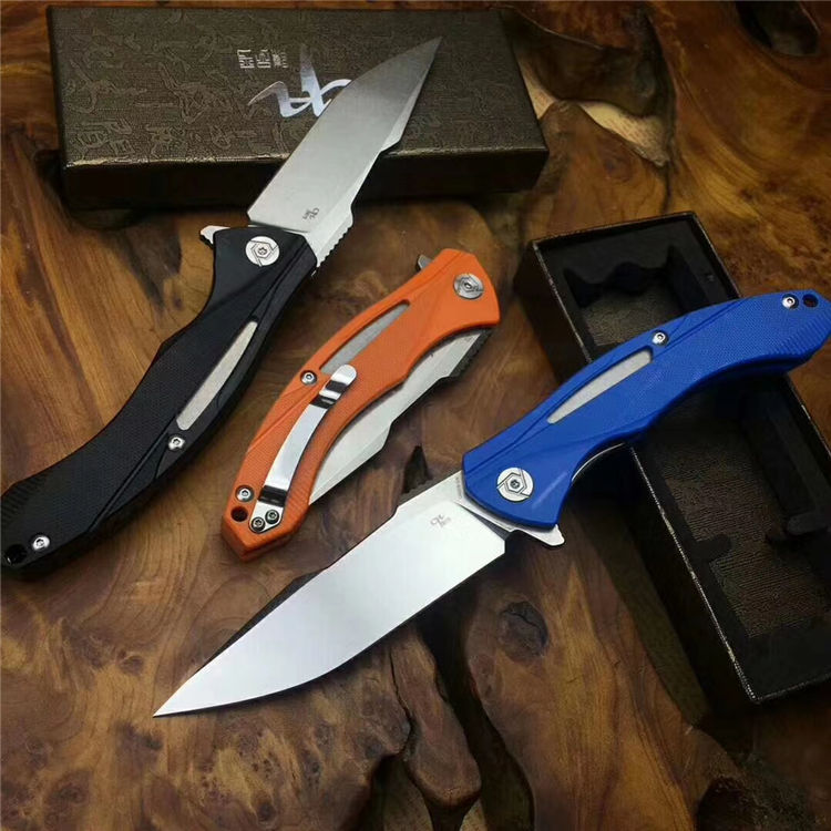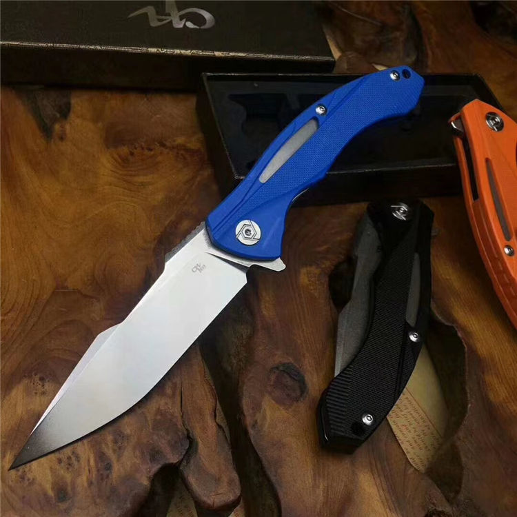 CH3519快开折刀 类型: 轴承快开折刀 全长: 22.5cm 刃长: 9.5cm 柄长: 13cm 刃宽: 2.9cm(最宽处) 硬度: 59HRC 厚度: 0.38cm 柄材:G10手柄 重量: 220克(含包装) 刃材: D2 其他: 彩盒