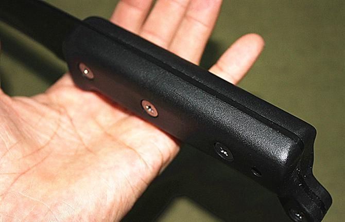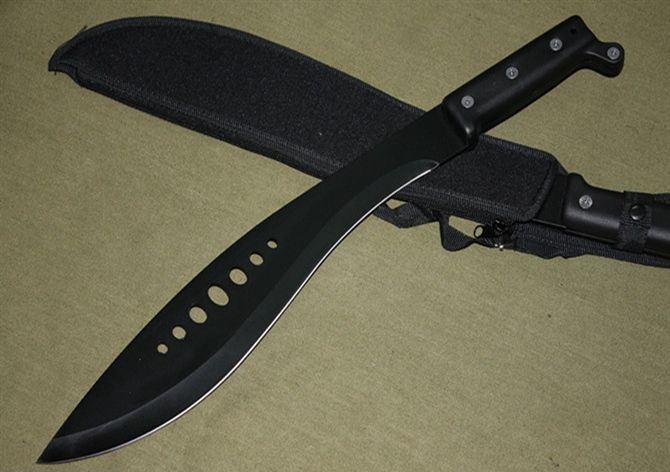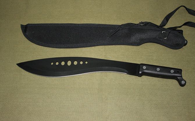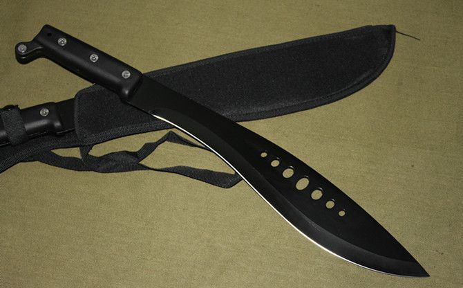 全长: 48cm 刃长: 33.5cm 柄长:12cm 刃宽:6.5cm(最宽处) 刃厚: 3mm 刃材: 440 硬度: 55 刃面: 发黑 柄材: ABS工程塑料手柄;刀身贯穿刀柄,一体龙骨结构! 重量: 500克(含尼龙鞘)