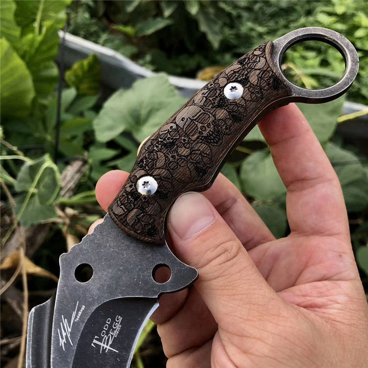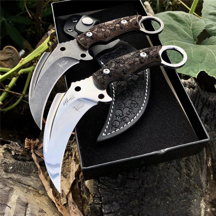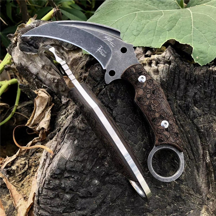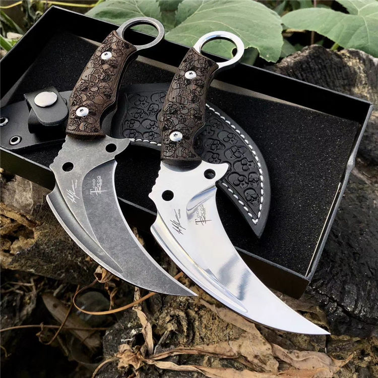 托德贝格神鹰爪刀 全长:250mm 刃长:100mm 柄长:150mm 刃最宽:45mm 刃厚:6mm 刃材:8cr18mov 重量:560g(含包装) 硬度:59HRC 表面:镜光 石洗任选 柄材:钢一体柄+黑檀木精雕 锁型:定锁 其他:精雕皮套