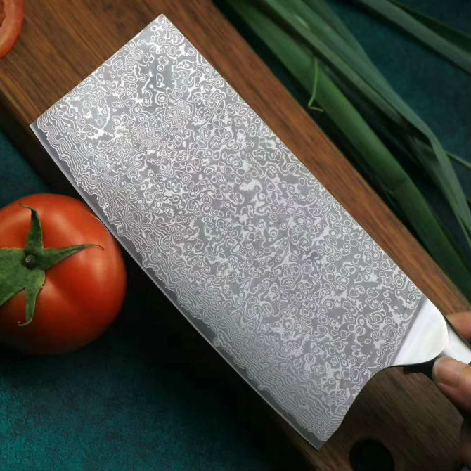 大马士革顺景菜刀 总长:31cm 刃长:18.2cm 刃宽:8.2cm 厚度:2MM 柄长:13.5cm 钢材:大马士革钢VG10(63层) 硬度:59-60HRC 热处理:真空热处理, 开刃方式:手工水磨开刃 表面花纹:大马士革浪迹纹 手柄材质:不锈钢头+黑G10材料+绿叶树脂隔片+印度柯檀木 重量:330g净重 包装:手工黄色纸盒