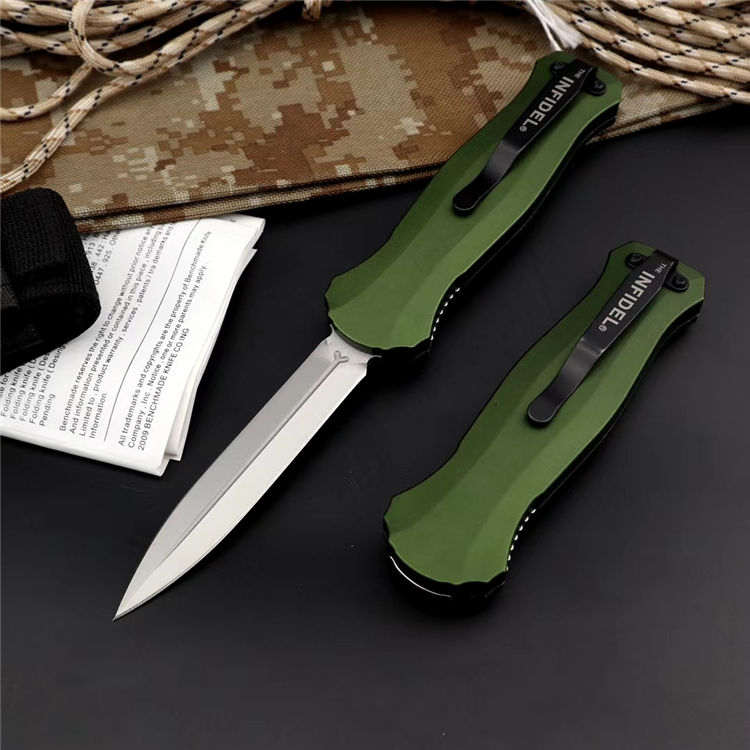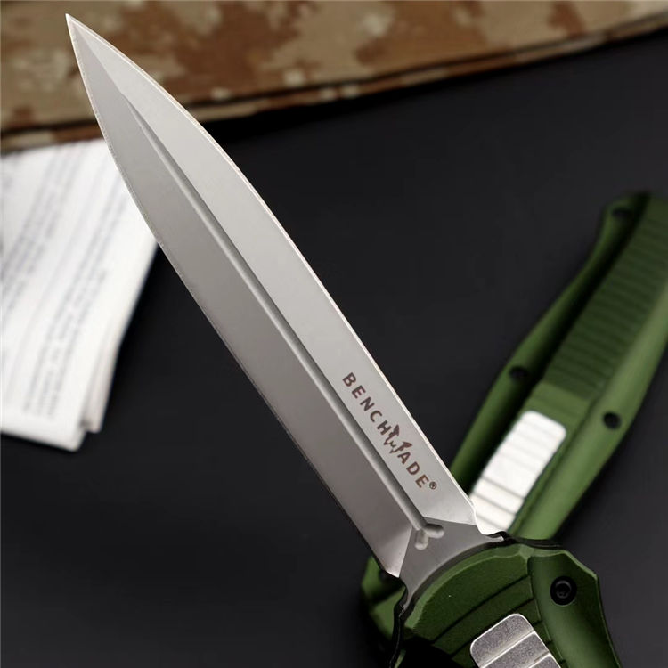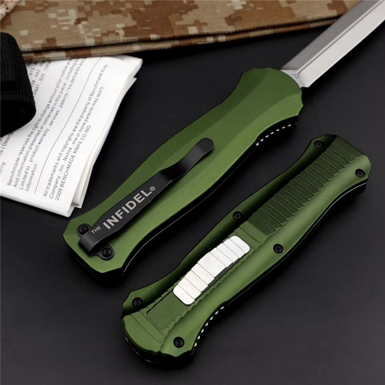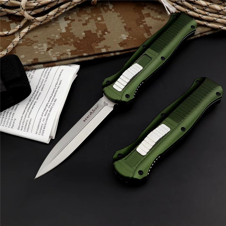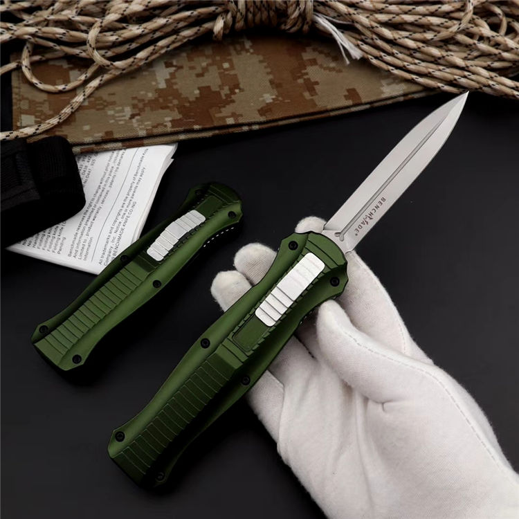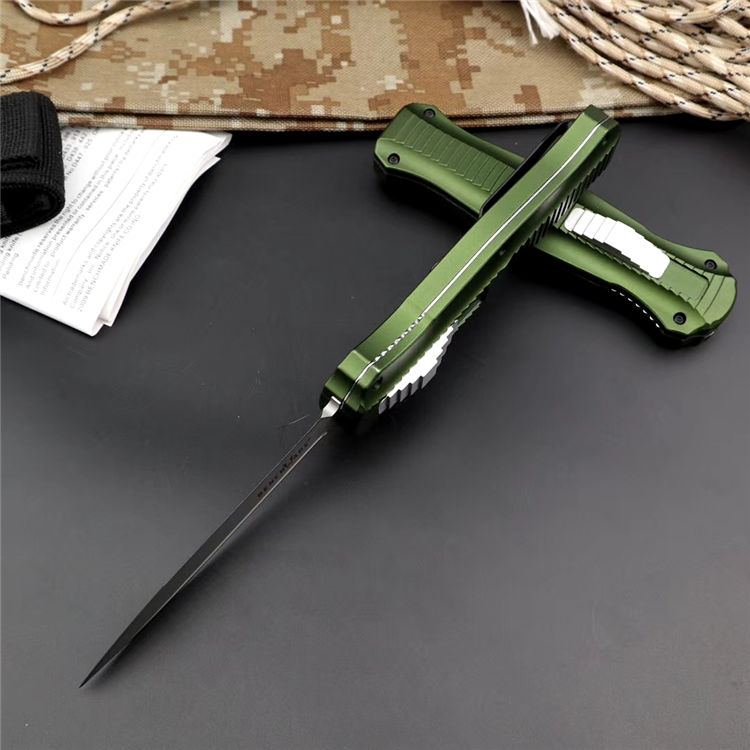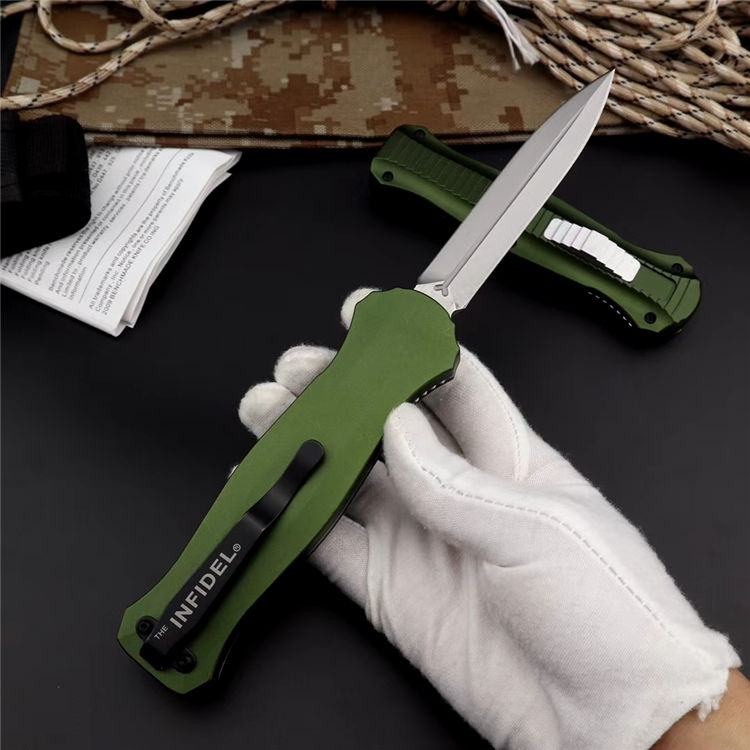 蝴蝶3310绿版直出跳刀 品牌:蝴蝶 全长:22.5cm 刃长:9.8cm 刃厚:3.2mm 刃材:D2 硬度:60HRC 总重量:205.0克(含包装物) 表面:精细沙光(刀刃) 锁闭:弹簧直出 柄材:6061铝材经CNC电脑锣成型,极度精密 刀鞘:尼龙套