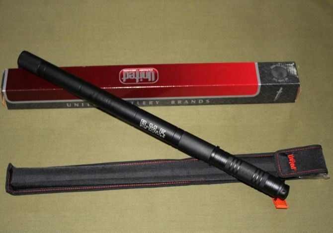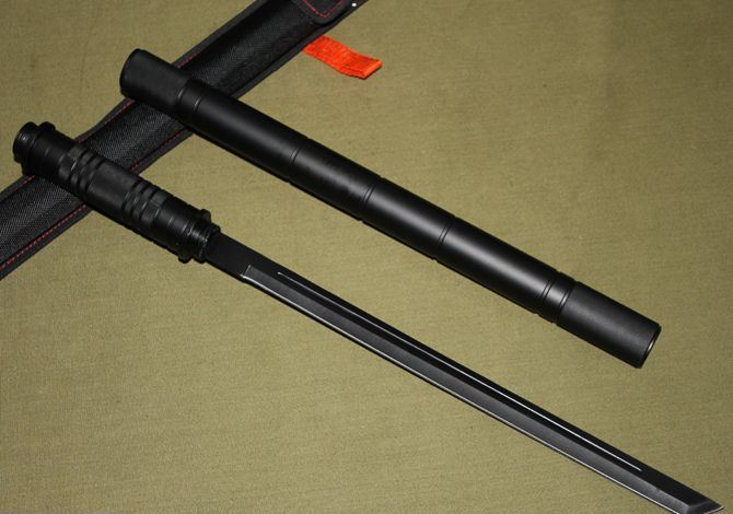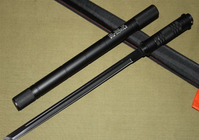 联合刀具.防暴警棍刀(升级版) 品牌:美国United联合刀具(超高仿品) 完全反接长度:95CM 刃长:37.2CM 完全正合长度:57.5CM 管径:3.25CM 刀厚:0.4CM 刃宽: 2.2CM 重量: 1000g 硬度: 56HRC 刀材质:440 不锈钢管材: 合金铝 柄材: 合金铝 表面:黑钛(不易刮花) 其他:双面血槽,武士刀头配附高档耐磨加厚尼龙套