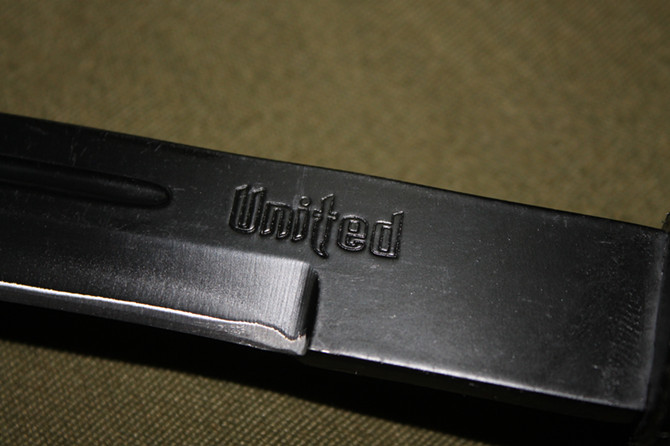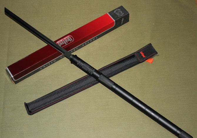品牌:美国United联合刀具(超高仿品) 完全反接长度:95CM 刃长:37.2CM 完全正合长度:57.5CM 管径:3.25CM 刀厚:0.4CM 刃宽: 2.2CM 重量: 1000g 硬度: 56HRC 刀材质:440 不锈钢管材: 合金铝 柄材: 合金铝 表面:黑钛(不易刮花) 其他:双面血槽,武士刀头配附高档耐磨加厚尼龙套
