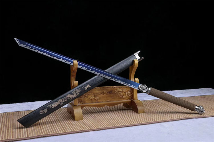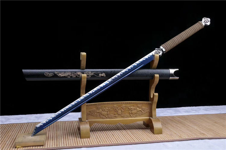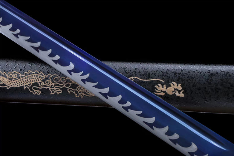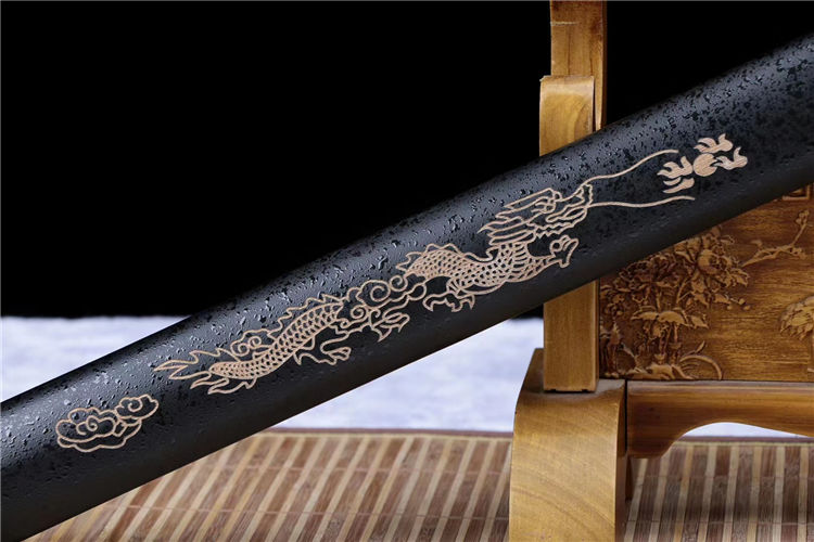 龙头唐横刀 刃材:极限锰钢手工锻造、大血槽设计、烤蓝,️刃口采用双线“火焰纹”推磨工艺,刃厚将0.7cm改为0.4cm、使得性能上得到了前所未有的突破 装具:独家龙头套装《独一无二》 柄材:独家棉绒绳缠绕 鞘材:中国龙鞘设计《独一无二》 适合:收藏 防身 情侣配送 乔迁送礼 武术健身 精美摆设 赠品:精美锦盒、护理油 性能:锋利度极高、轻松横扫一排水、韧性可达90度 工艺:刀身千锤百炼、经打胚、热锻、铲、锉、磨、热处理(淬火)回火、初修、精修、等龙泉古法数十道手工制作而成