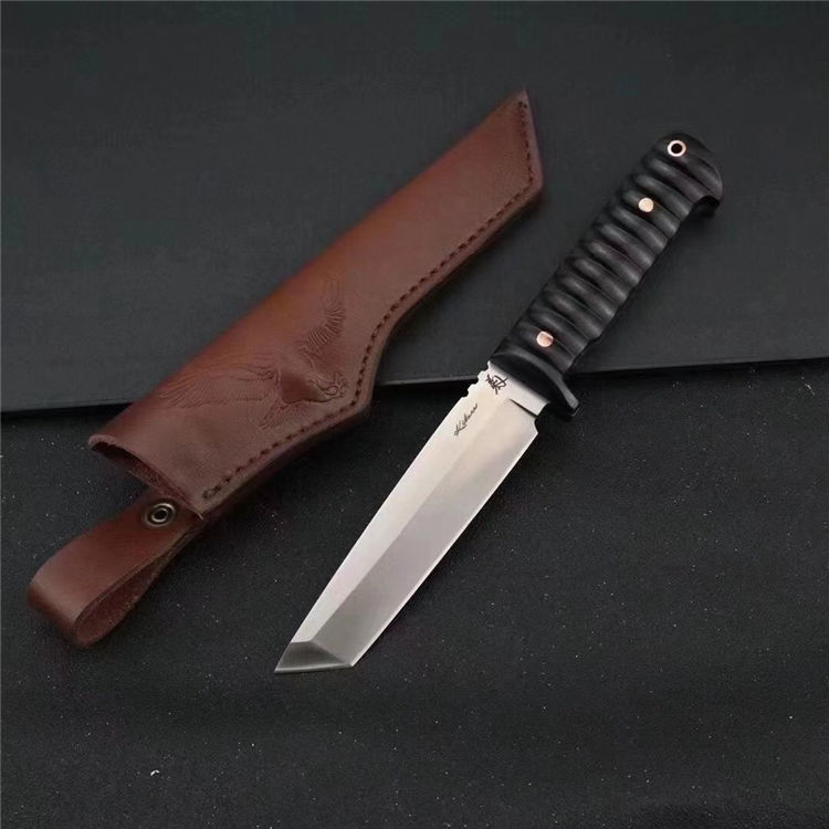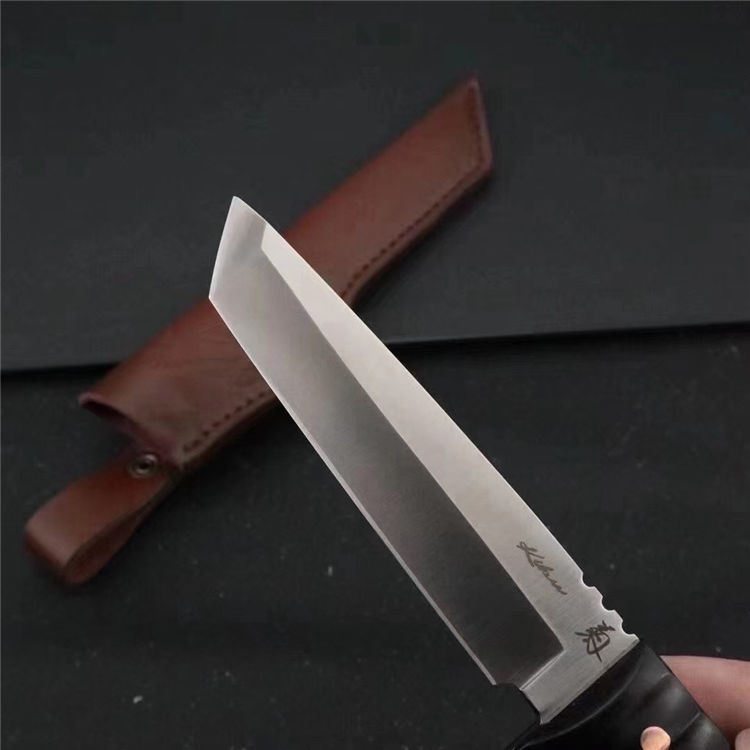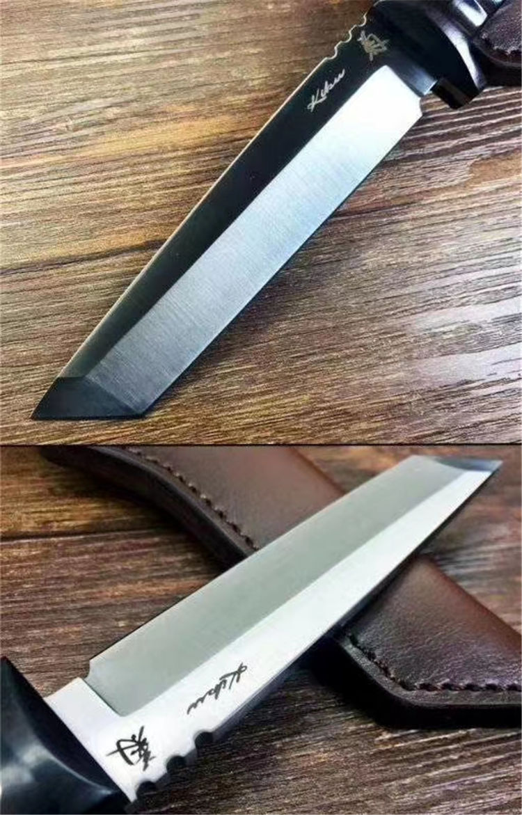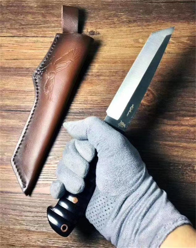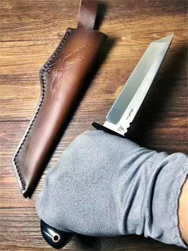 菊田战刃武士刀 全长:245mm 刃长:125mm 柄长:120mm 刃厚:5mm 柄材:黑檀木加铜钉 刃材:DC53 硬度:60HRC 净重:250克(不含包装) 包装:精美合子 刀鞘:皮鞘搭配