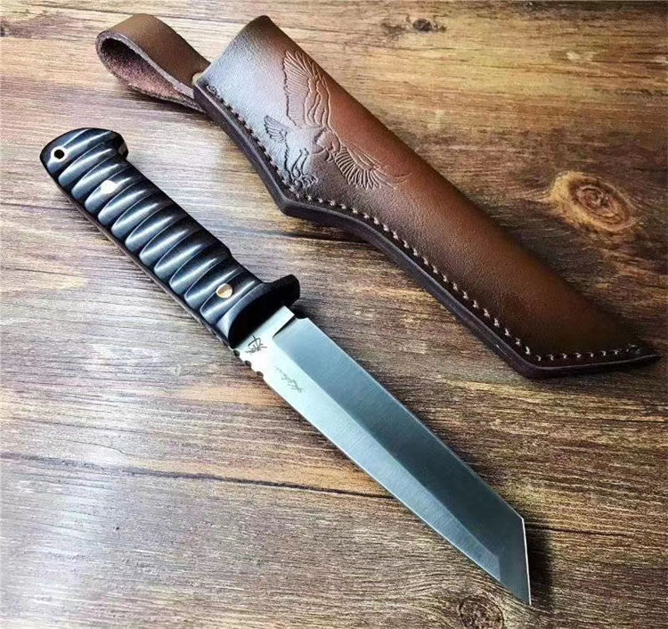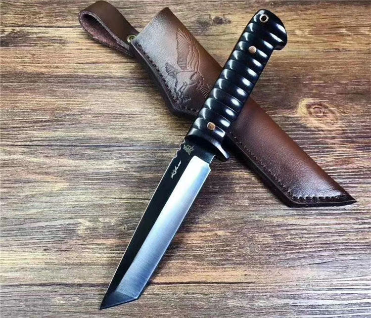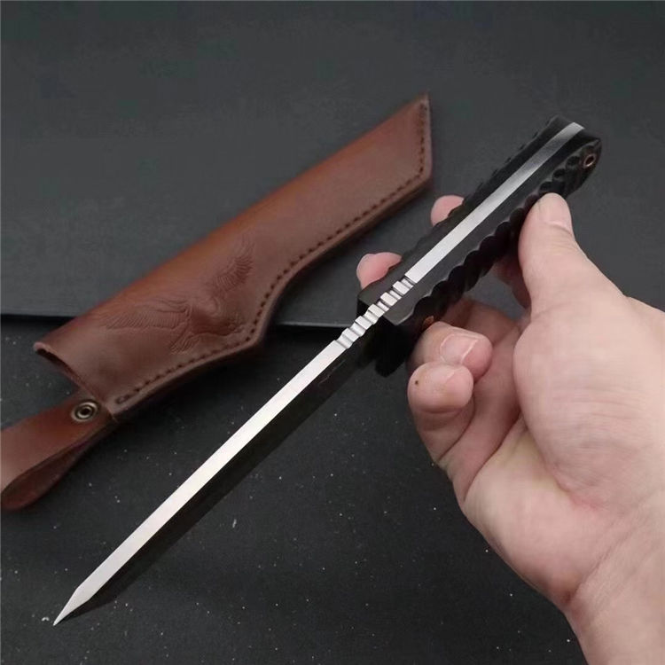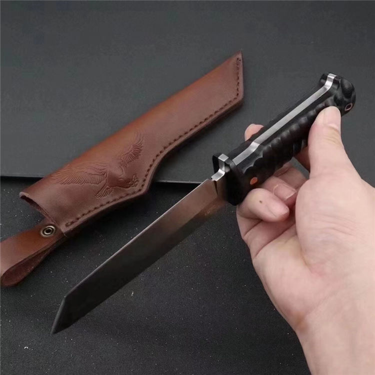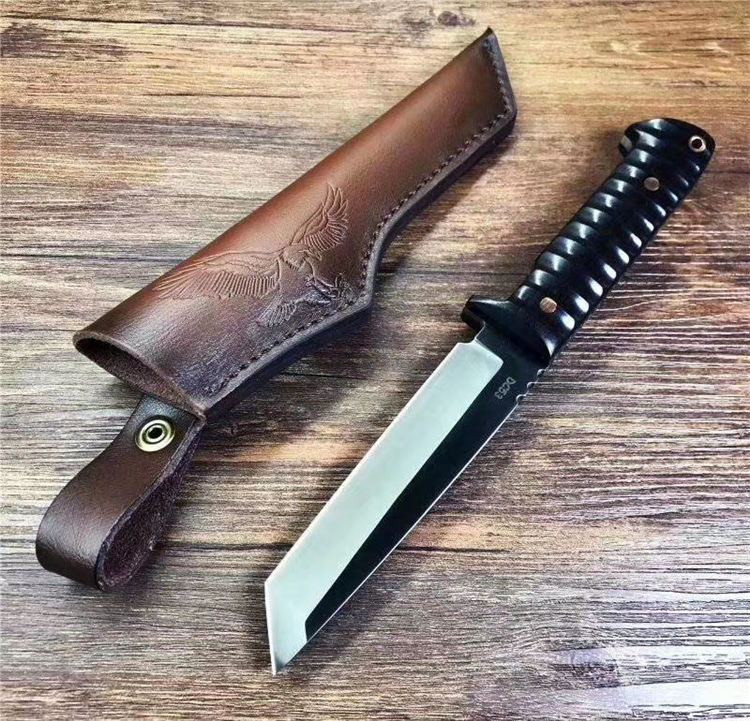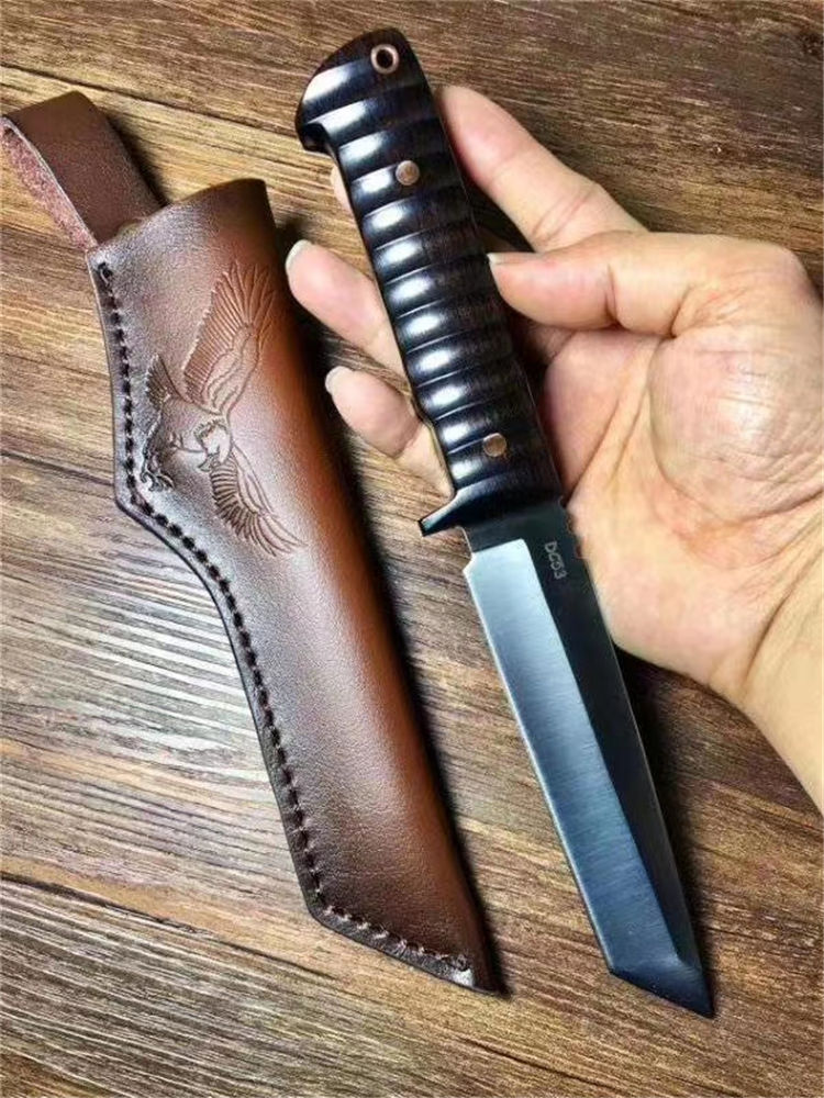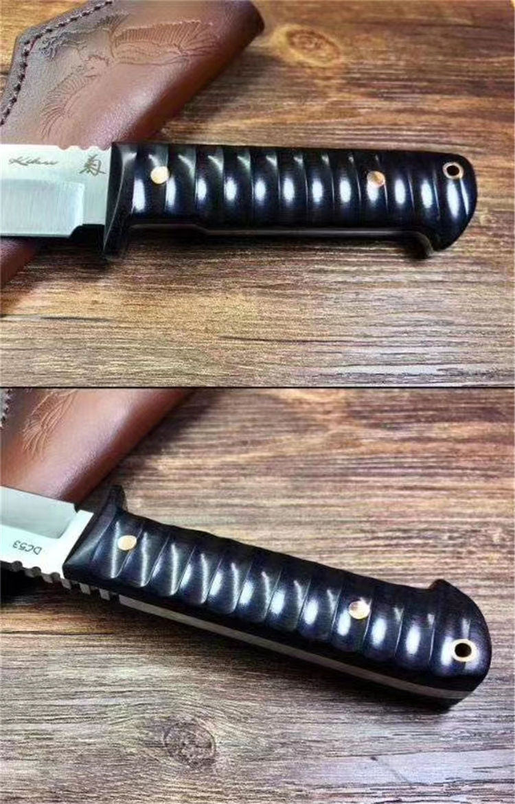菊田战刃武士刀 全长:245mm 刃长:125mm 柄长:120mm 刃厚:5mm 柄材:黑檀木加铜钉 刃材:DC53 硬度:60HRC 净重:250克(不含包装) 包装:精美合子 刀鞘:皮鞘搭配