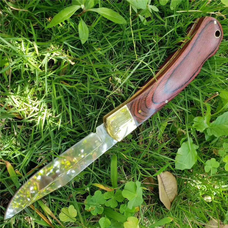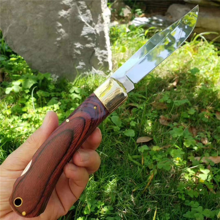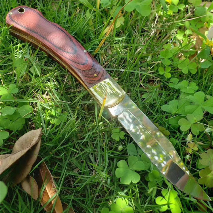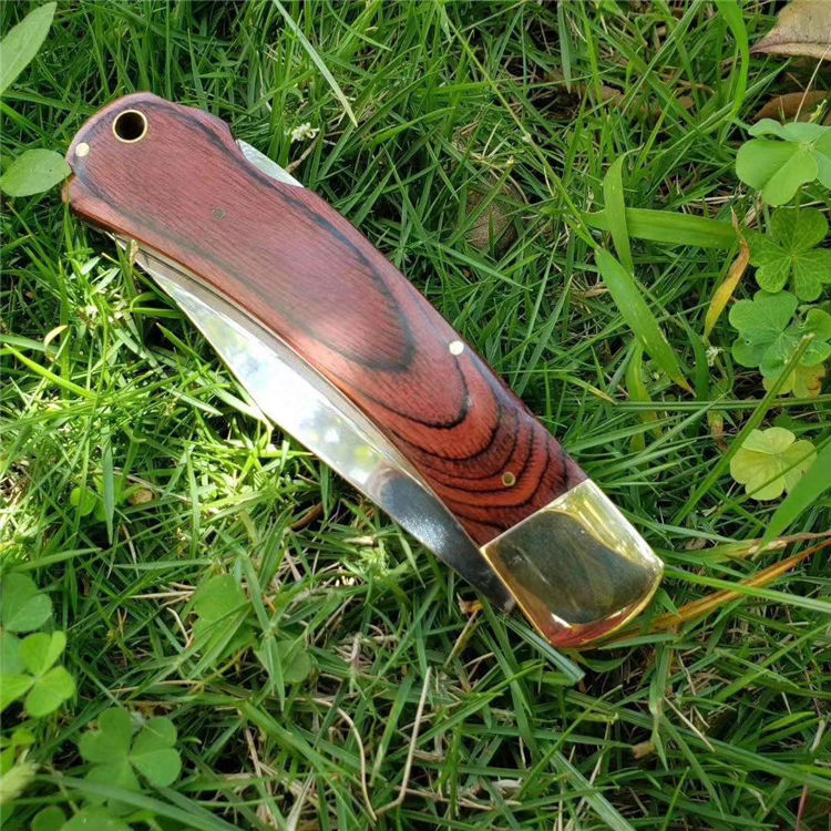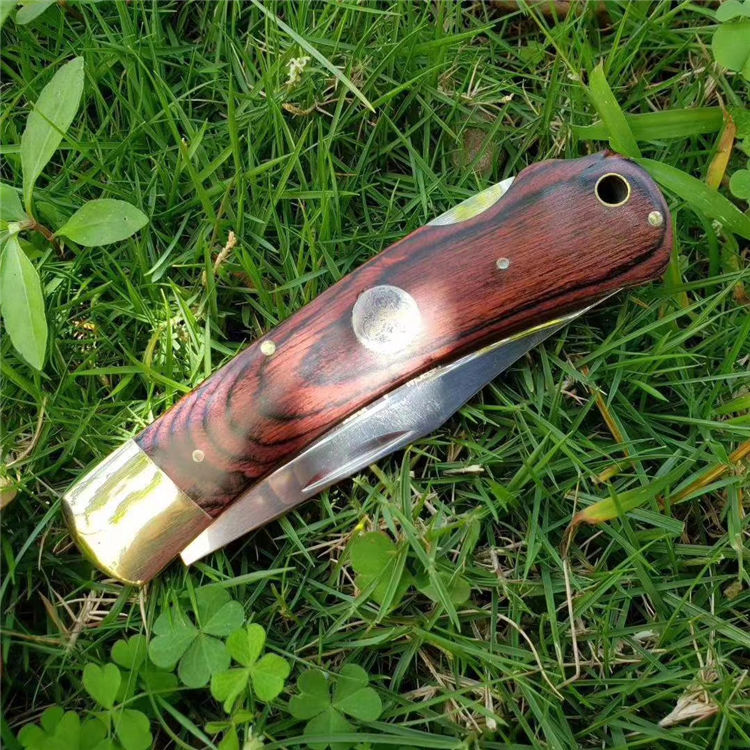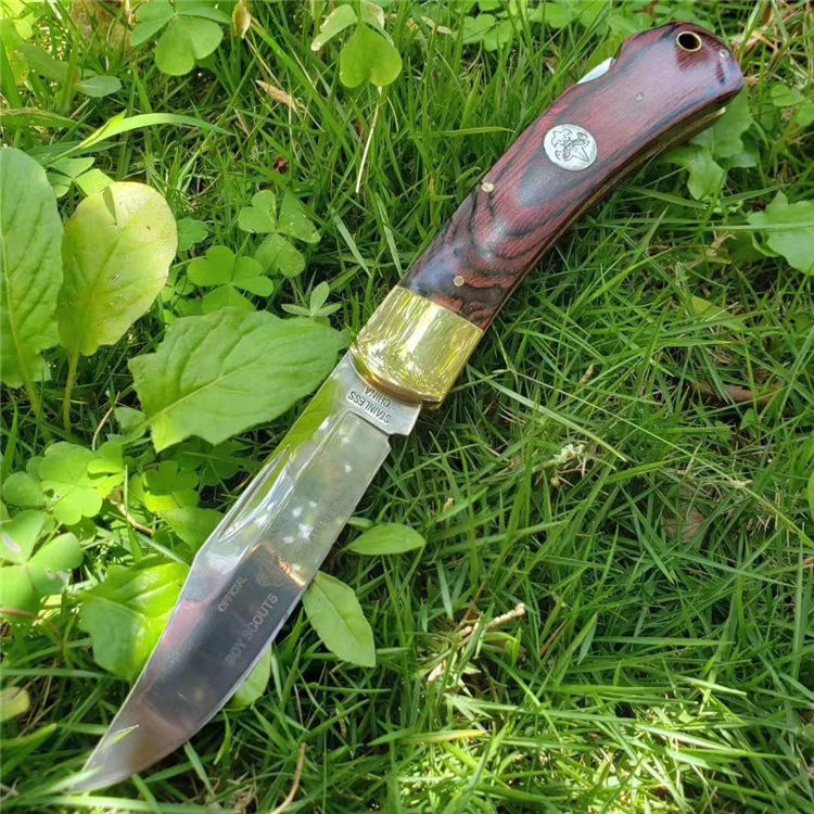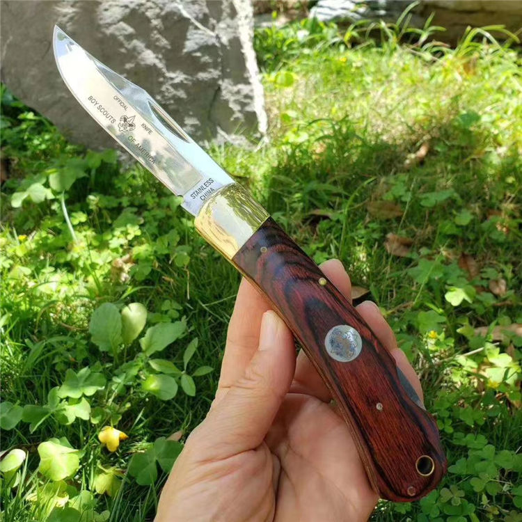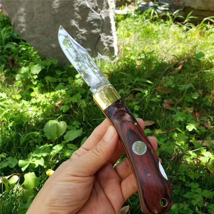 美国童子军折刀 全长:22.3CM 刃长:9CM 刃厚:0.3CM 柄长:12.5CM 材料:440C 硬度:57 柄材料:纯铜头+木柄 锁:背锁