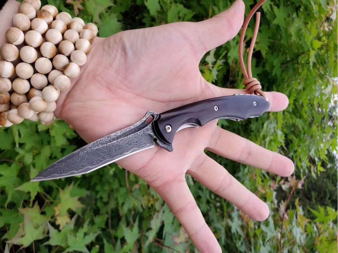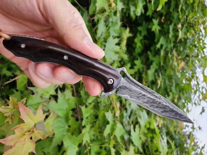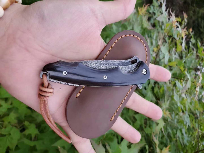 简师傅大马士革黑鲨折刀 全长:19cm 刃长:8.6cm 刃厚:3.5mm 硬度:60HRC 配置:头层牛皮手工缝制皮套,赠送简师傅收藏证书,复古礼盒包装